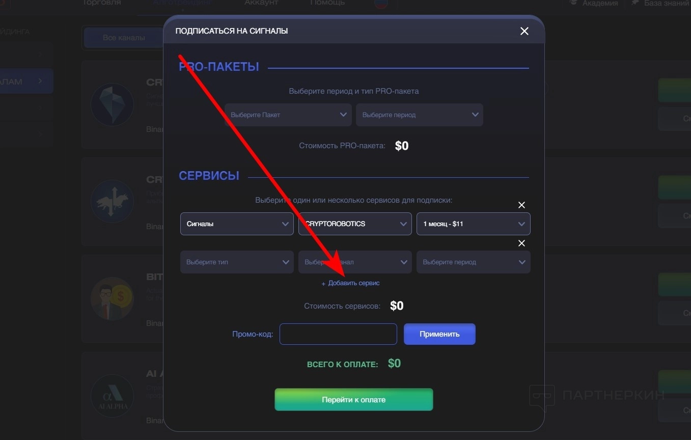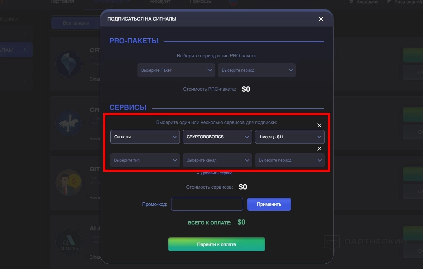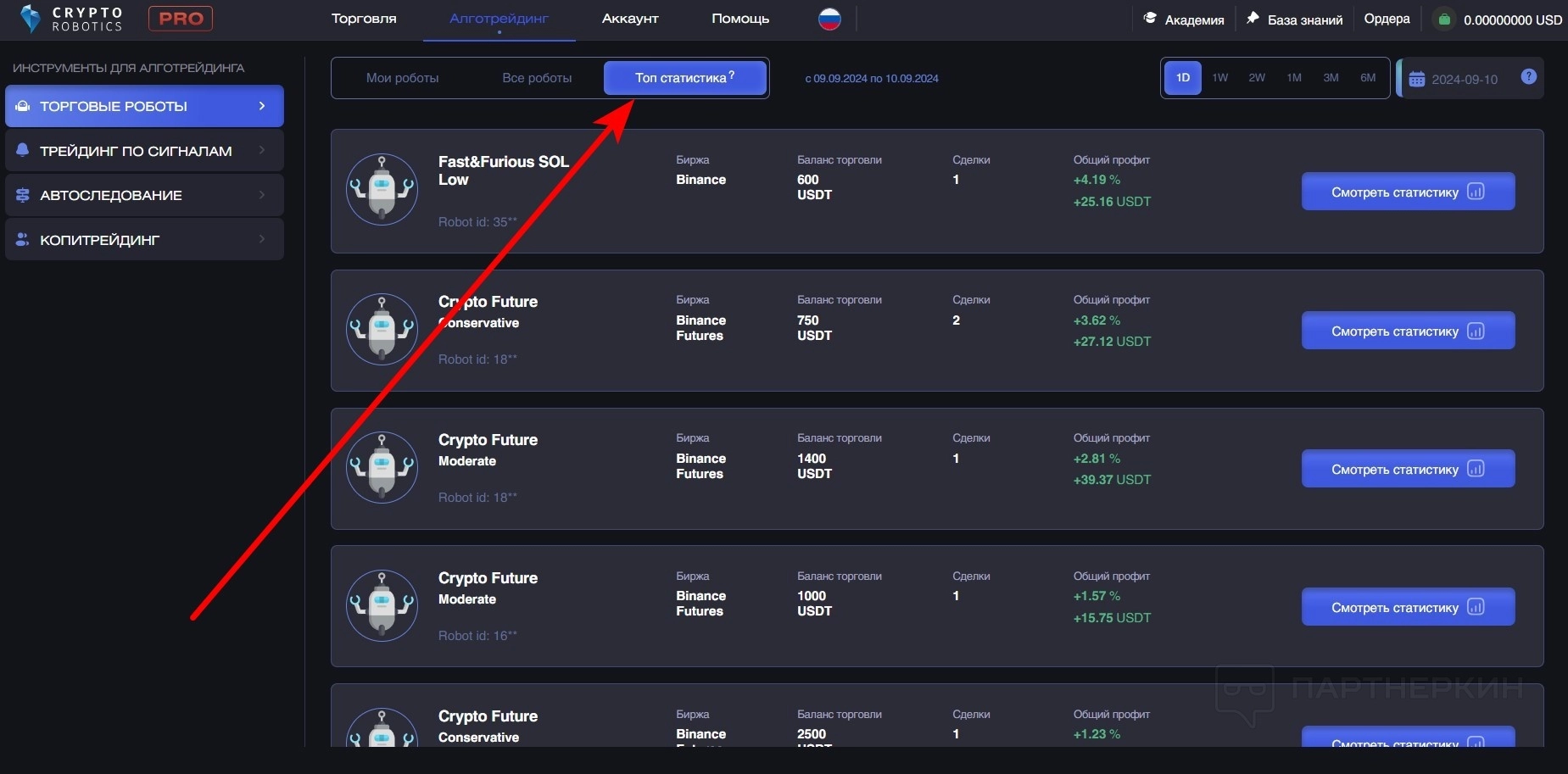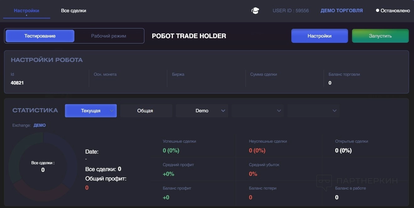 Можно выбрать готового бота или настроить свою стратегию. Роботы от партнеров обладают своими настройками. С каждым ботом можно ознакомиться. Для добавления своей стратегии нужен пакет PRO. Выбор бота происходит во вкладке «Все роботы».