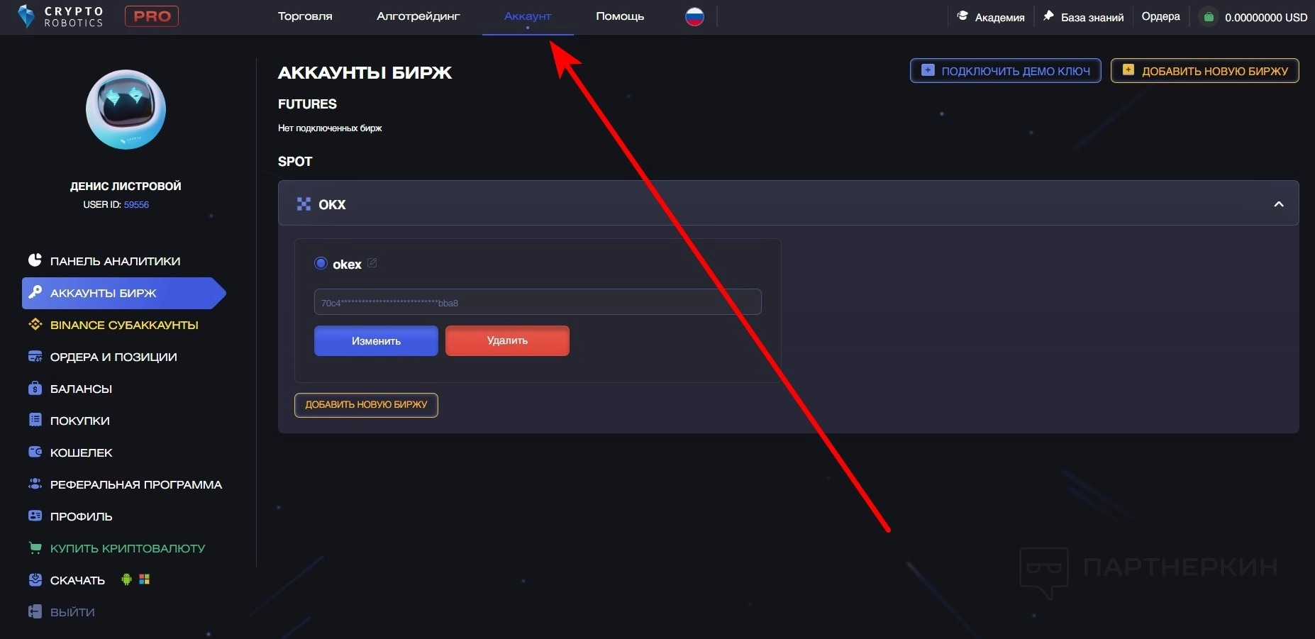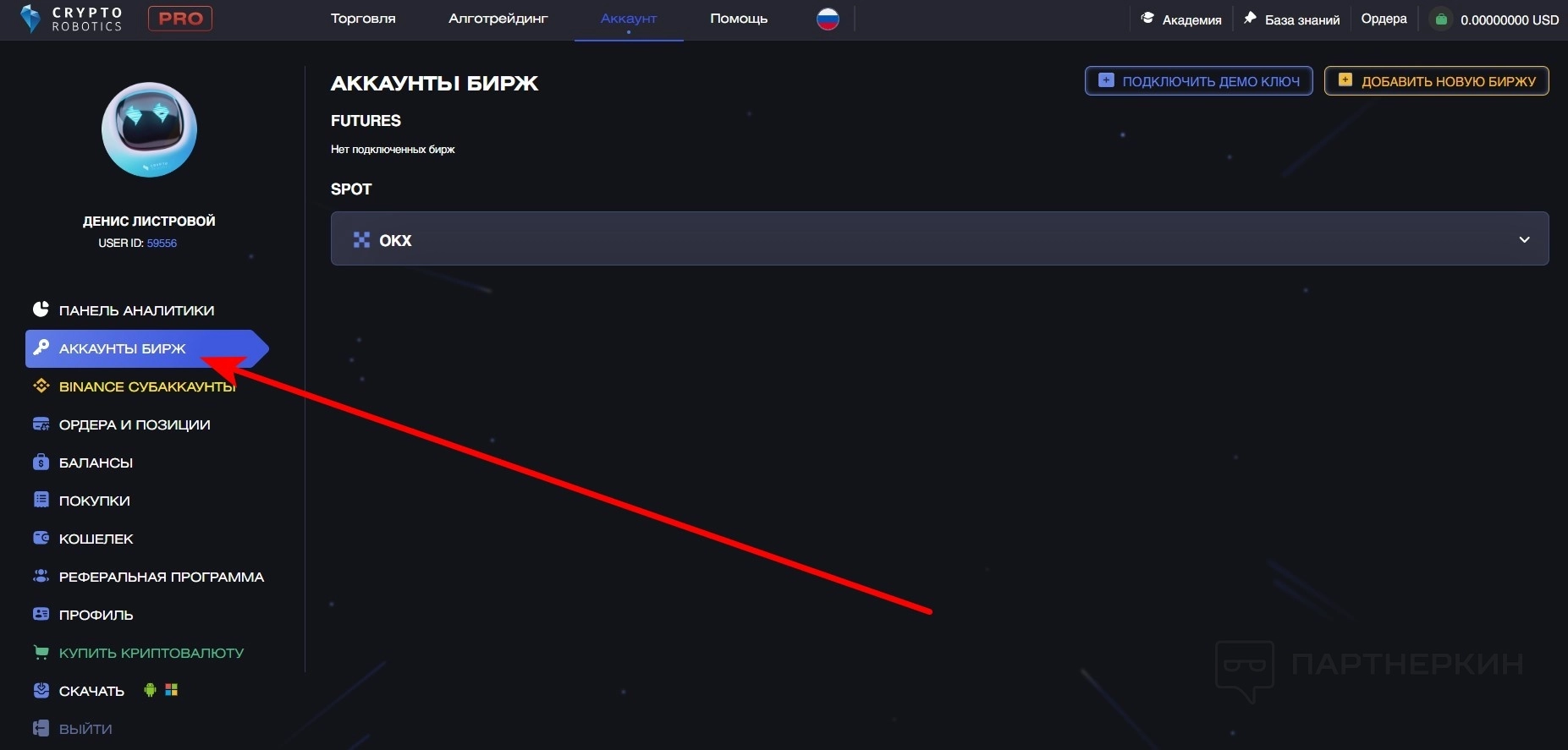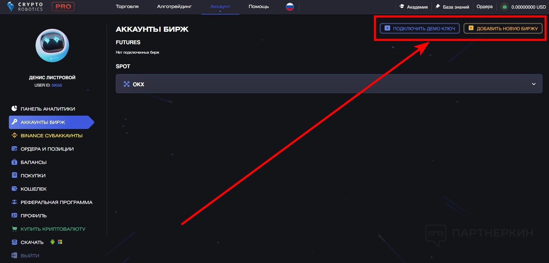 - Выберите «Добавить новую биржу», или «Подключить демо-ключ» (если нужно потренироваться.