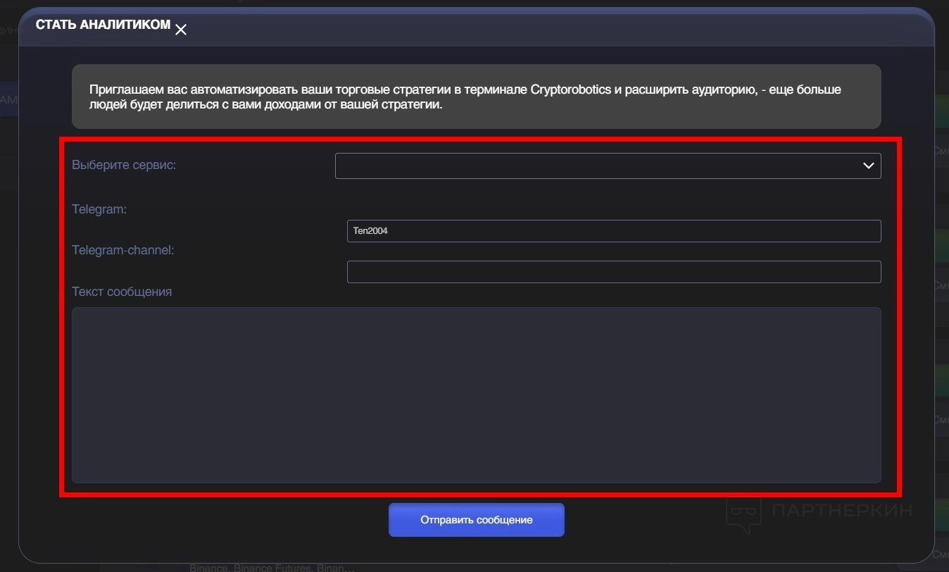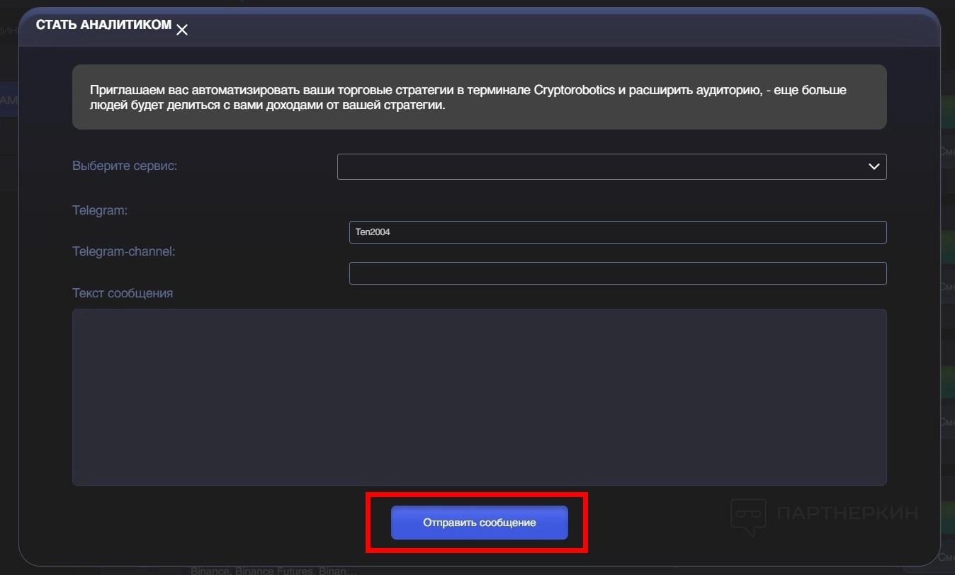 - Заполните регистрационную форму: тип сервиса для сигналов, аккаунт телеграмма, адрес канала, текст сообщения.