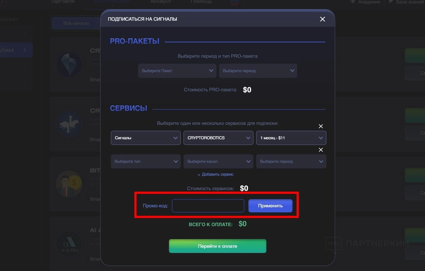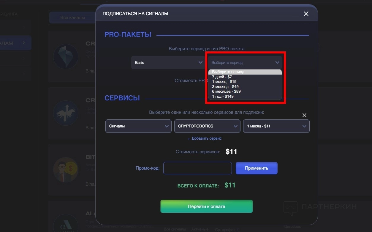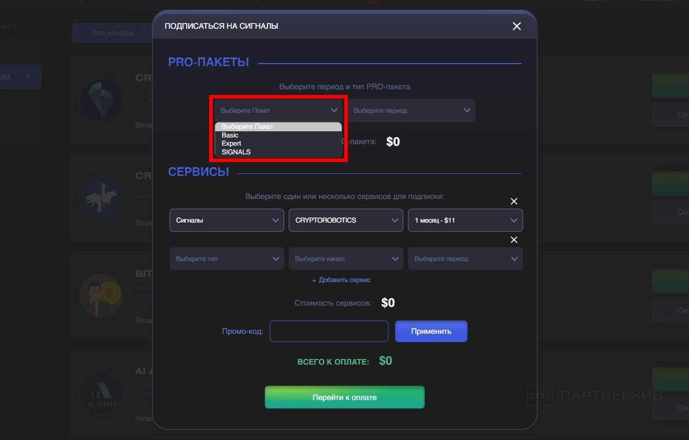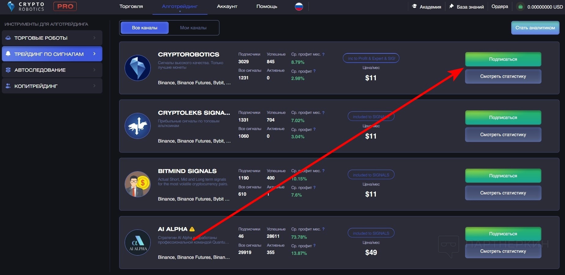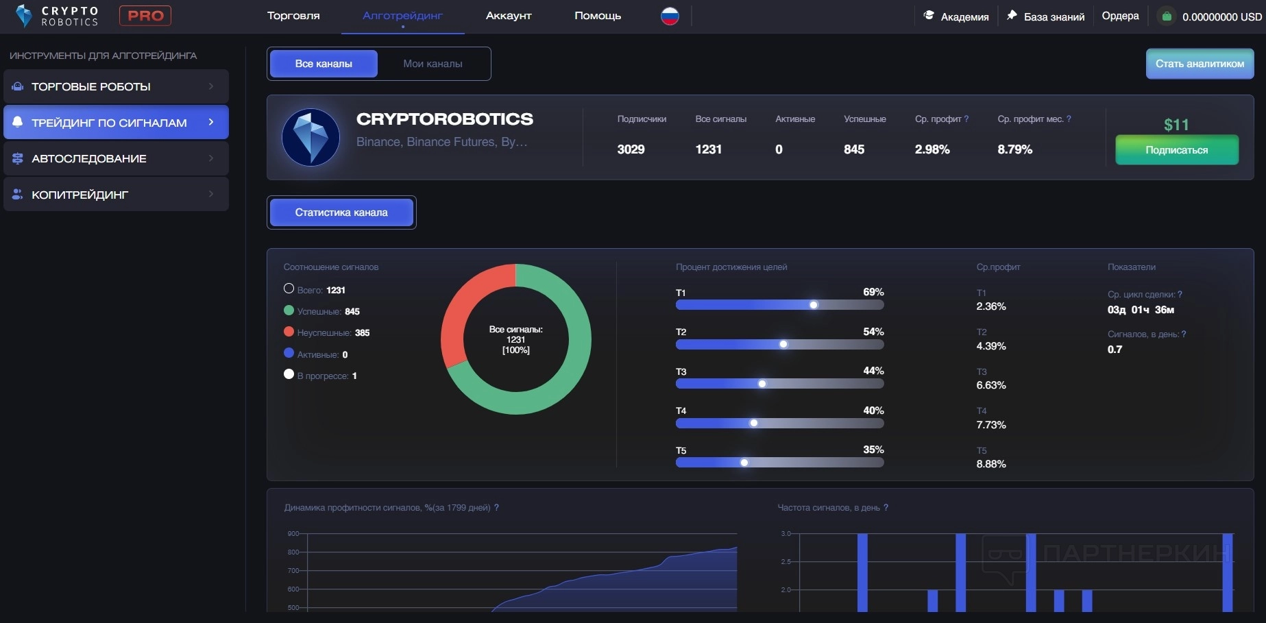 Пакет, предлагающий доступ к трейдингу на 14 биржах и 10 сигнальным каналам за $79 в месяц (со скидкой). Среди каналов:
