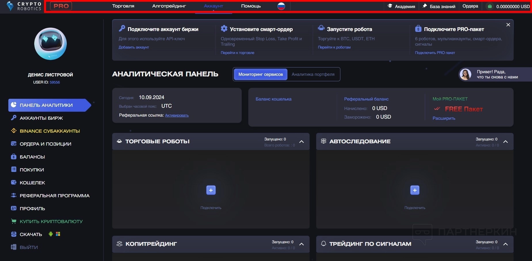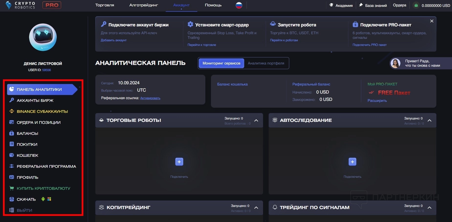 - Панель аналитики. Вся информация про деятельность пользователя: основной баланс, подключенные рефералы, созданные боты и так далее.