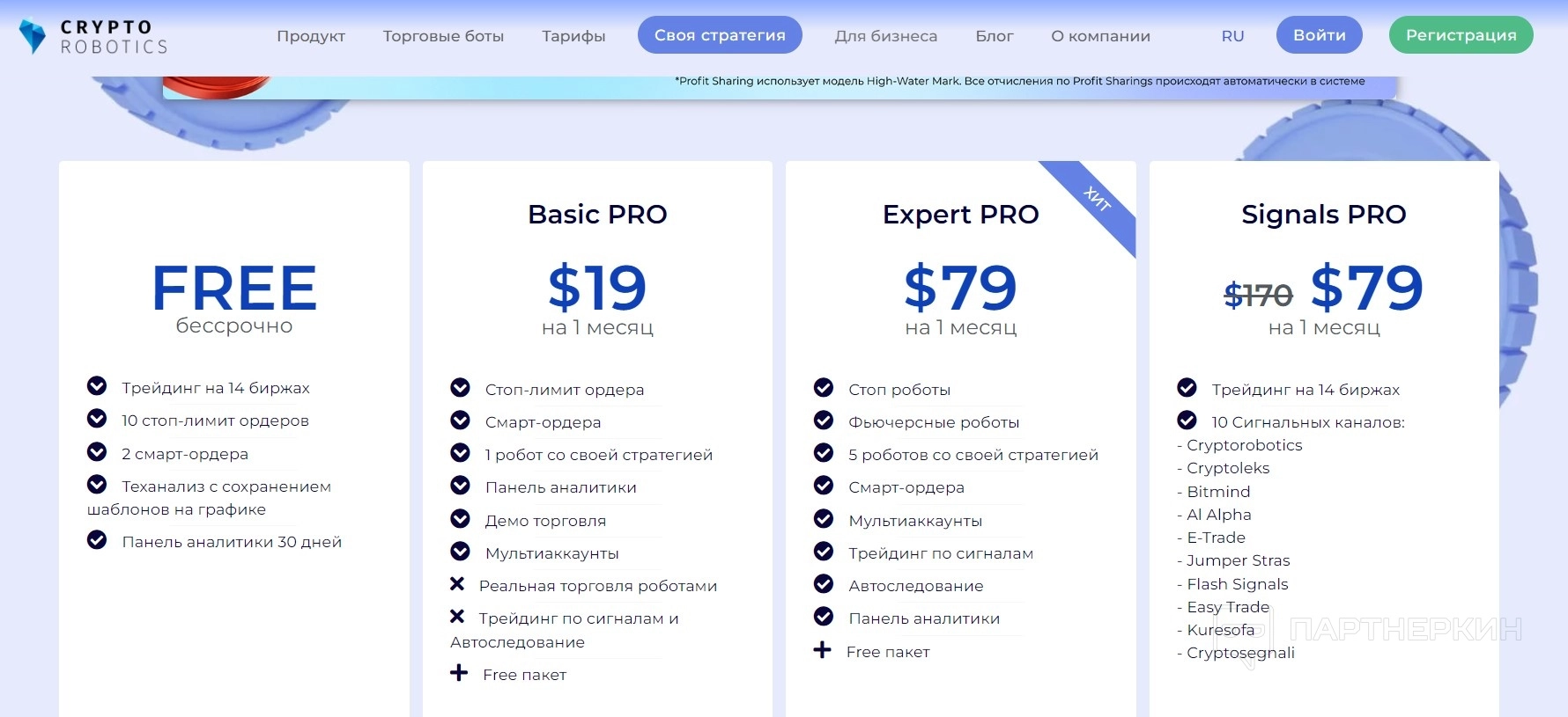 - Profit Sharing (FREE). Бессрочный бесплатный план, который предоставляет базовые возможности для трейдинга на 14 криптобиржах. Пользователи могут использовать до 10 стоп-лимит ордеров, 2 смарт-ордера, возможность сохранять шаблоны теханализа на графике и получать доступ к панели аналитики на 30 дней.