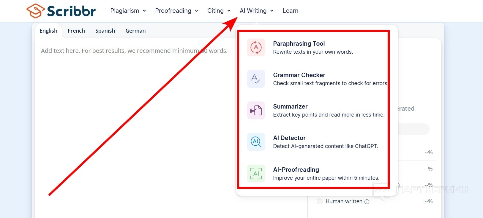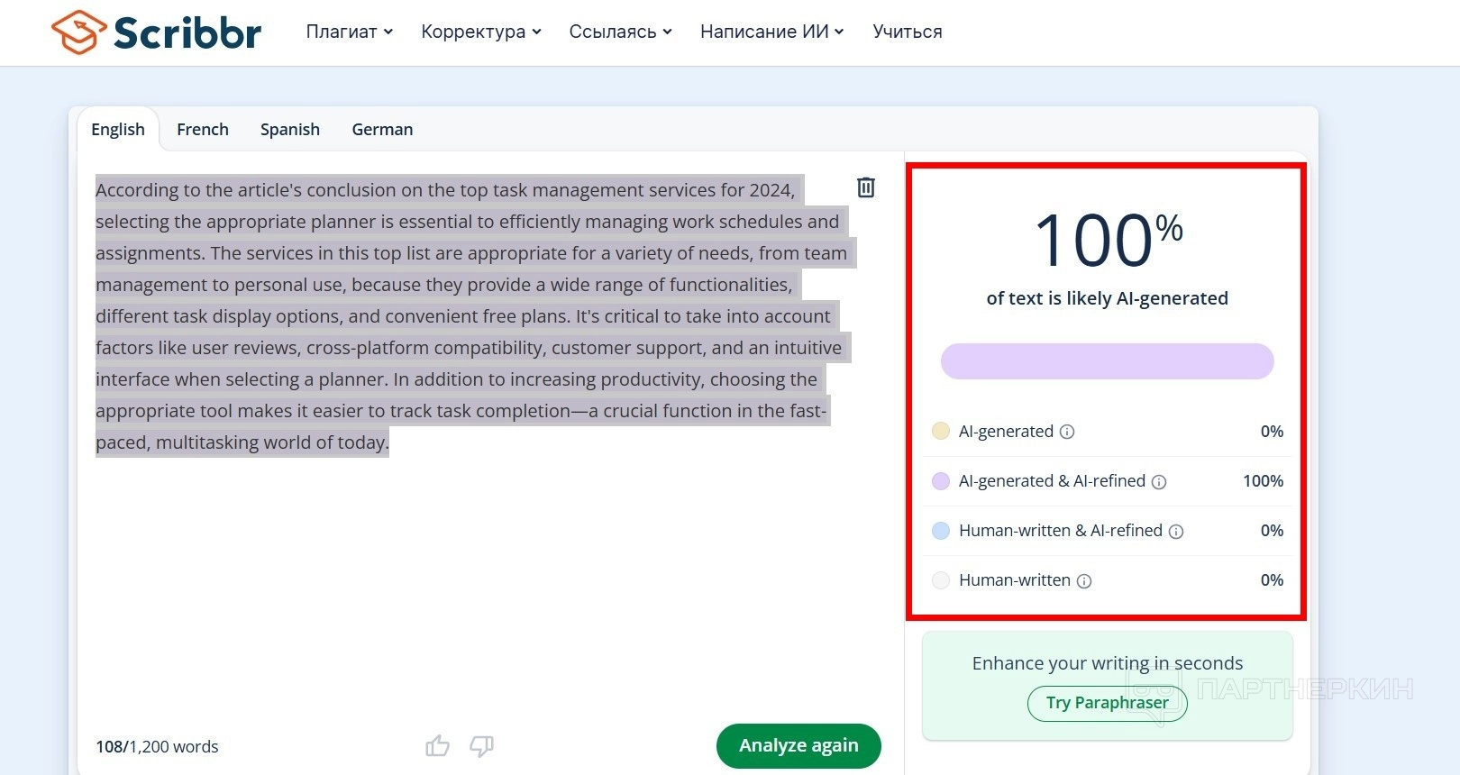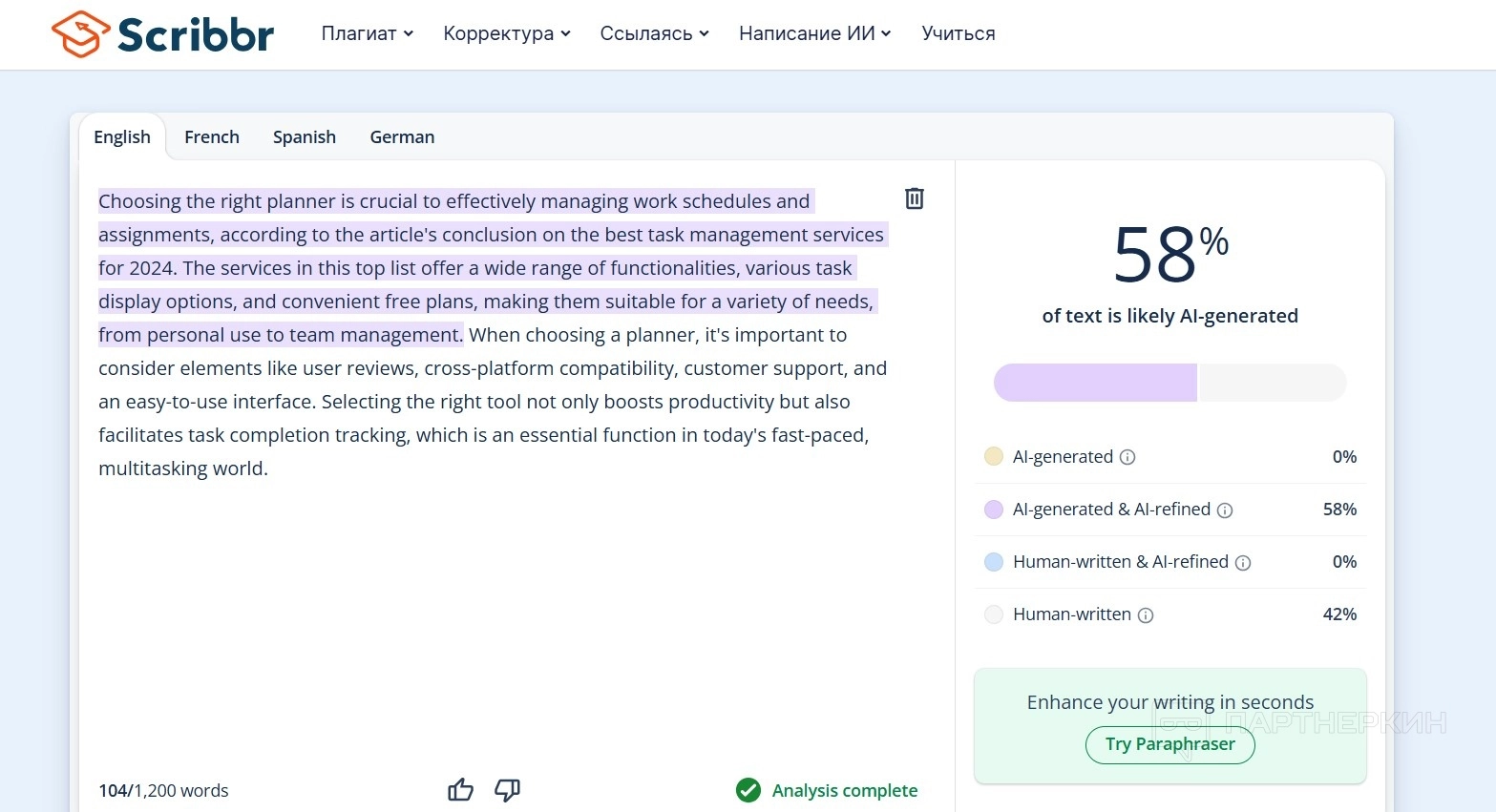 работает в связке с Scribbr Paraphrasing Tool. То есть, вначале пользователь проверяет текст на наличие ИИ. Потом с помощью другого инструмента вносит коррективы.