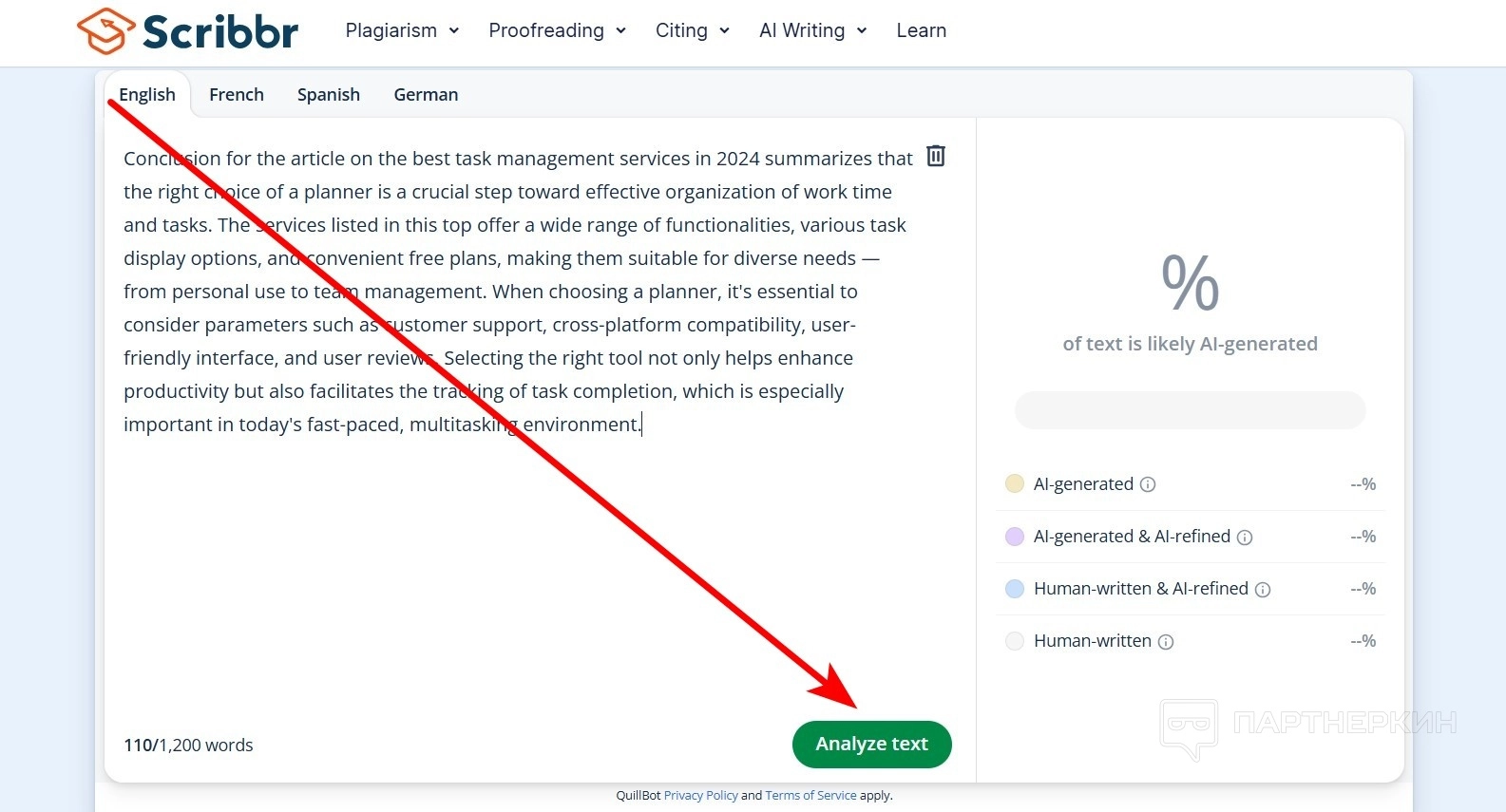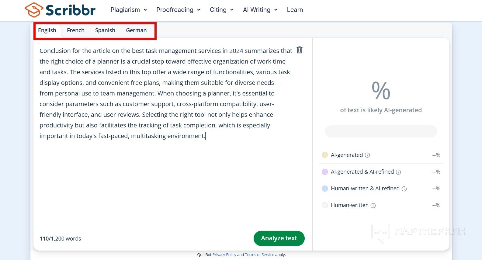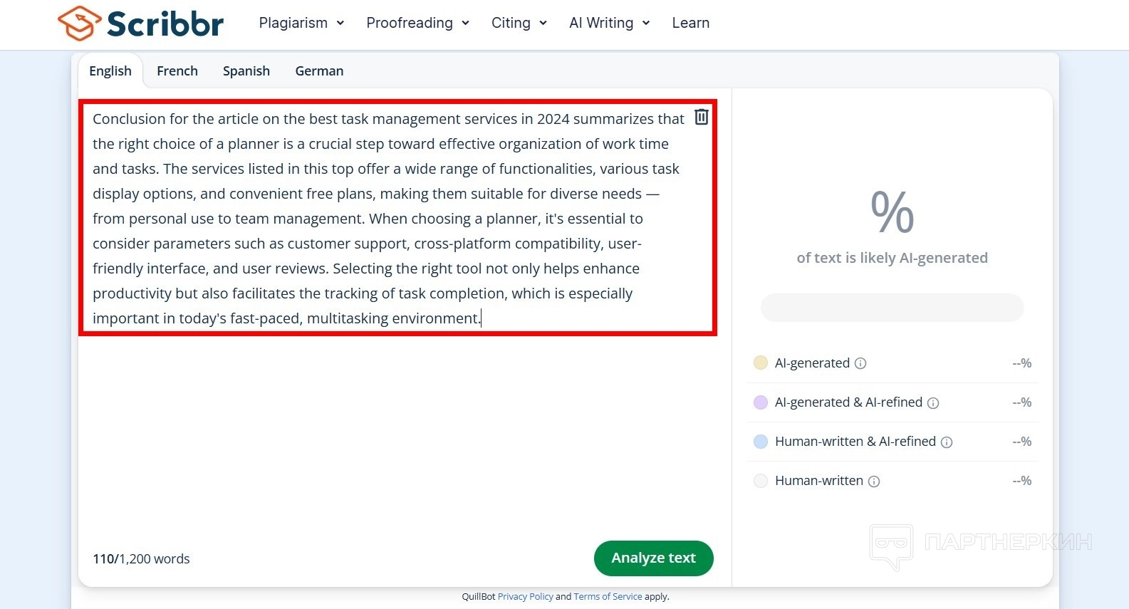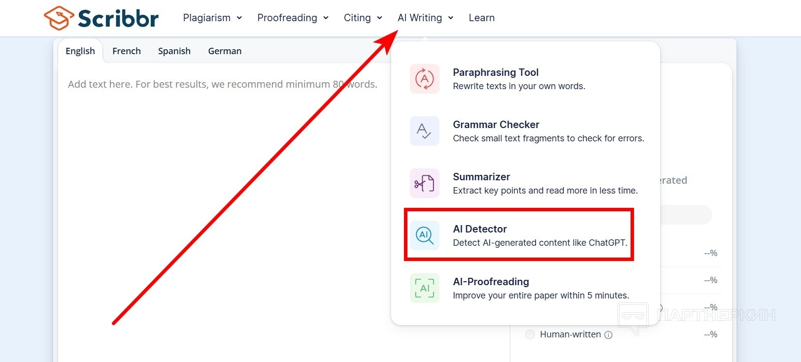 работает в связке с Scribbr Paraphrasing Tool. То есть, вначале пользователь проверяет текст на наличие ИИ. Потом с помощью другого инструмента вносит коррективы.