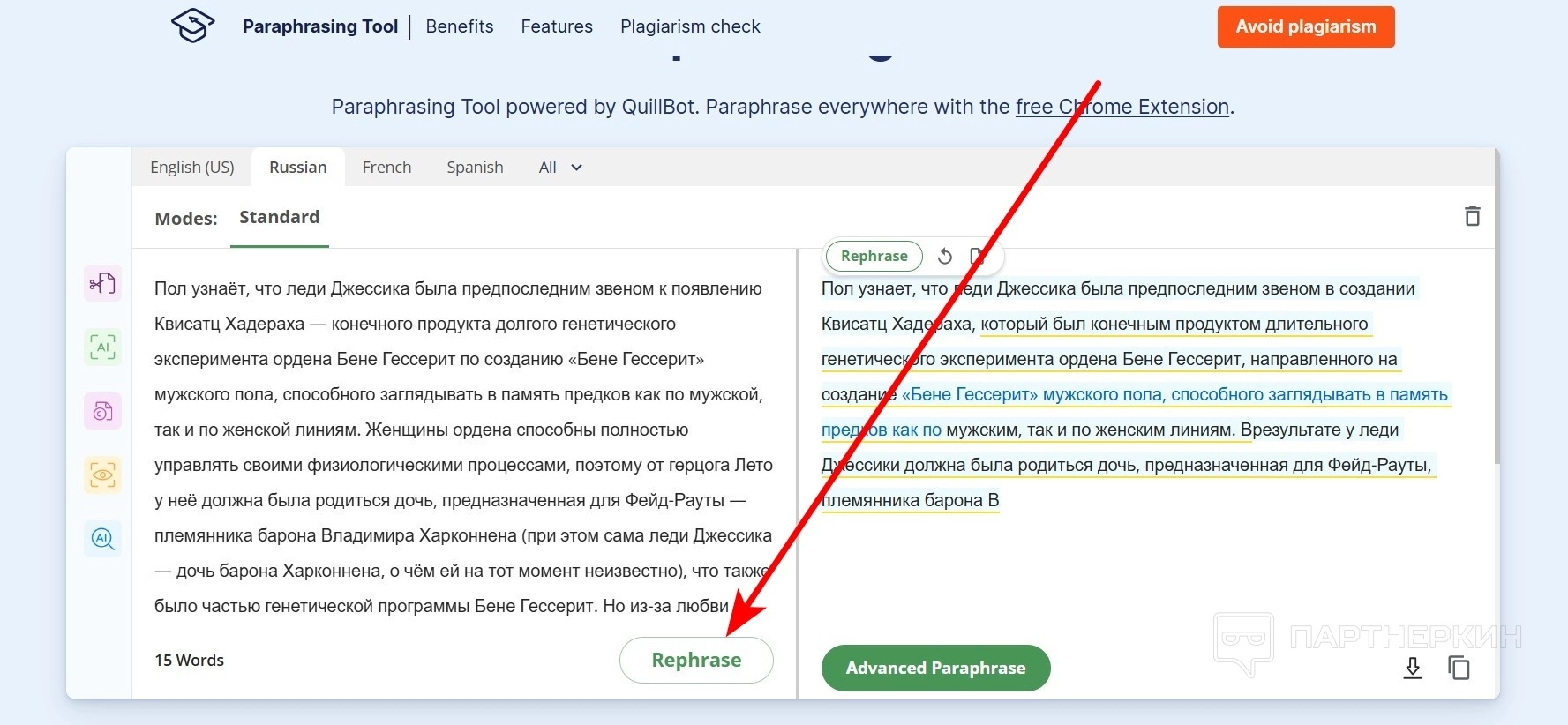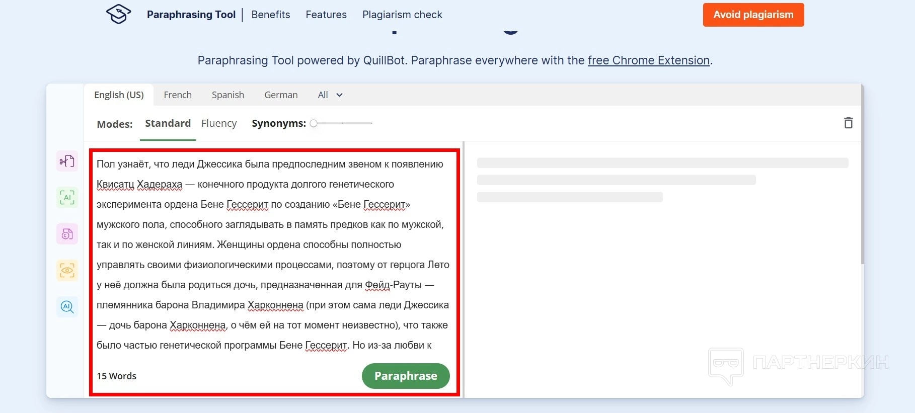 1. Вставьте в левое окно текст, который хотите перефразировать. Нажмите на кнопку Paraphrase. Число Words показывает, сколько слов осталось.