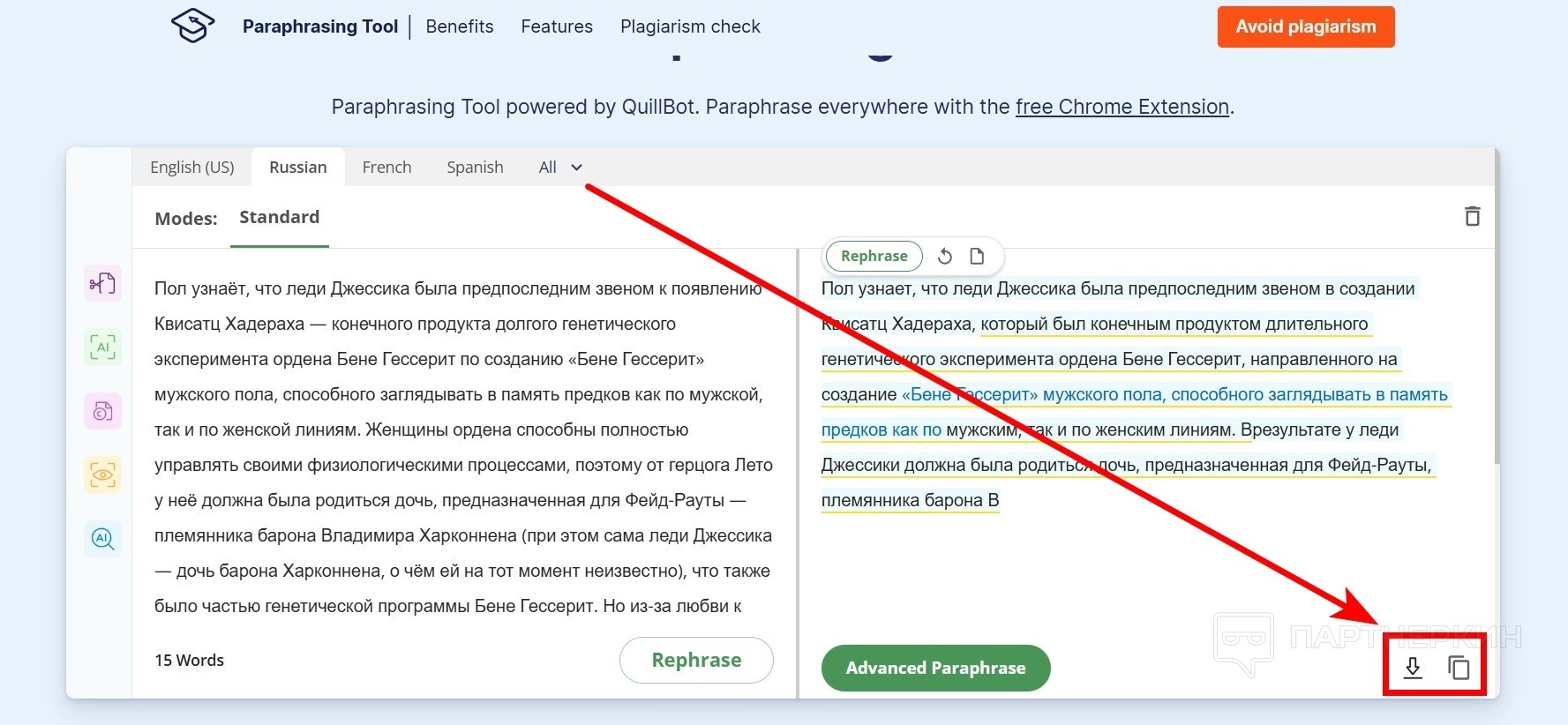 1. ИИ перефразирует текст. Результат появится в правом окне.