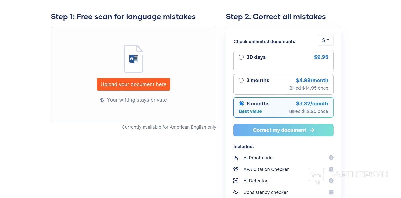 Инструмент платный. Стоимость месячной подписки начинается от $9,95. Однако возможности AI Proofreader позволяют устранить грамматические и стилистические ошибки и улучшить подачу материала. Документ будет соответствовать высоким стандартам.