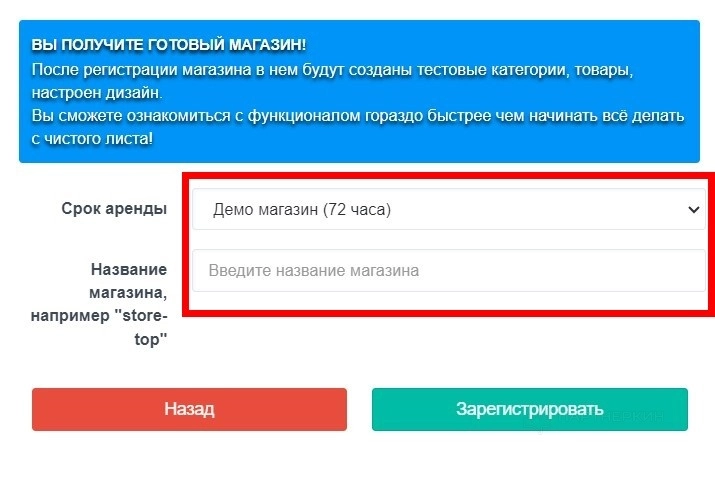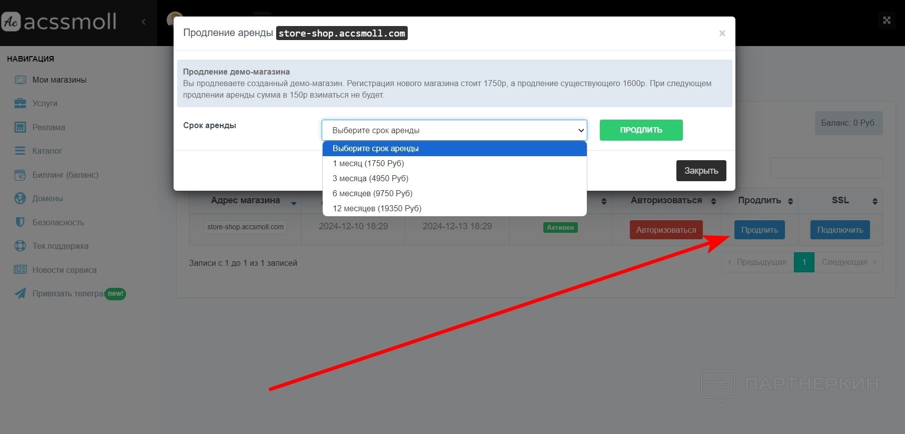 1. Раскроется новое меню. Выберите срок аренды и укажите название магазина.