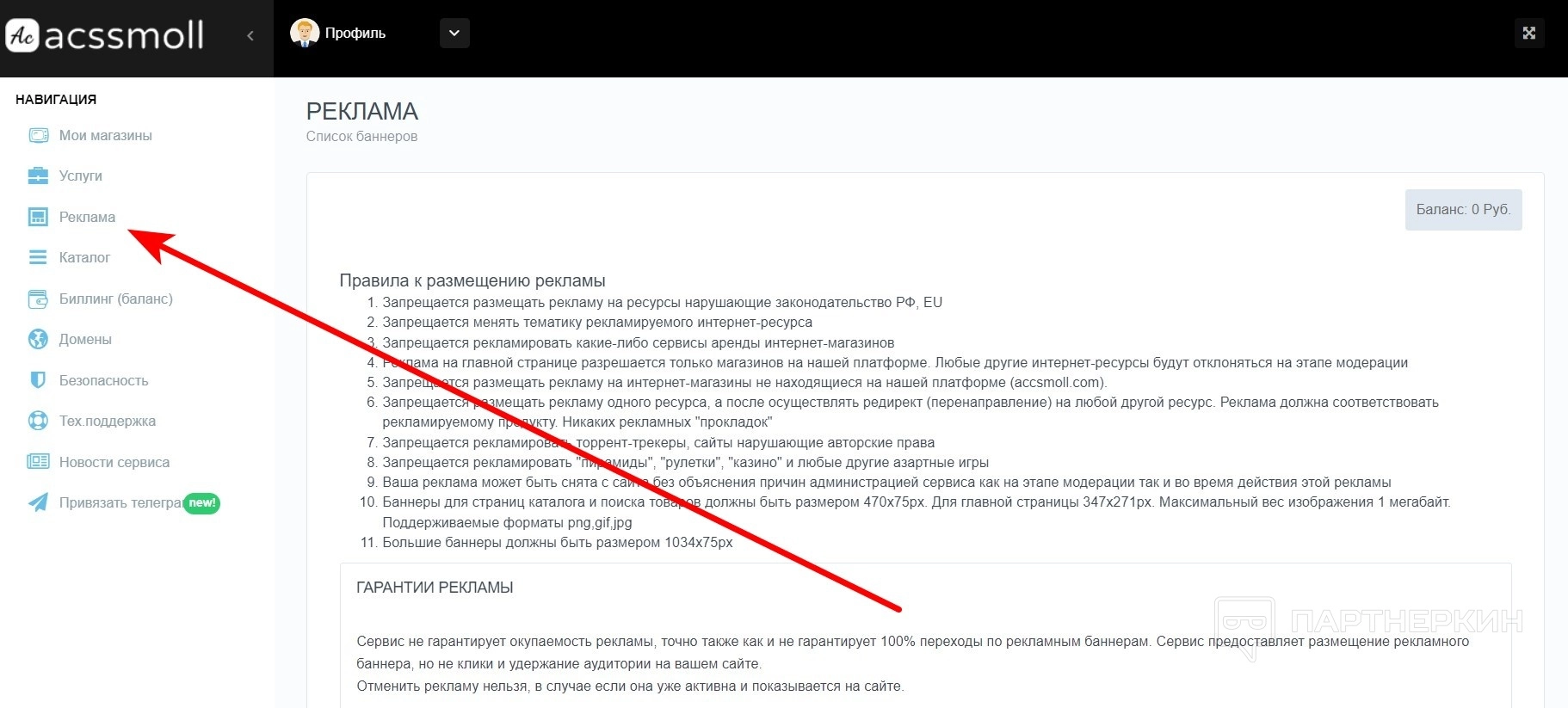 Дополнительная услуга, которая позволяет размещать на страницах баннеры. Однако сервис не гарантирует окупаемость рекламы. То есть платформа предоставляет площадку. Кликами занимается владелец сайта. Также отменить рекламу нельзя, если она работает и выставлена на сайте.