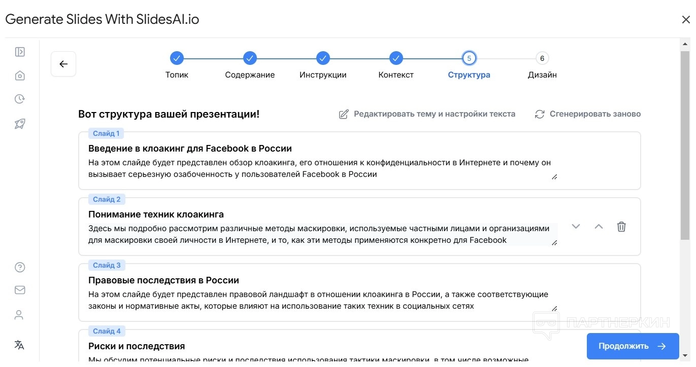 - ИИ сгенерирует структуру презентации. По желанию слайды и текст можно отредактировать.