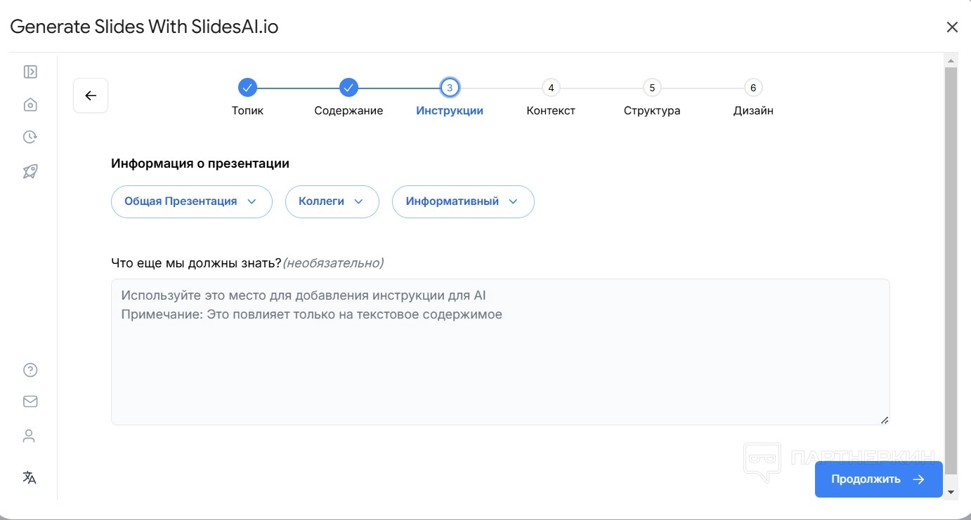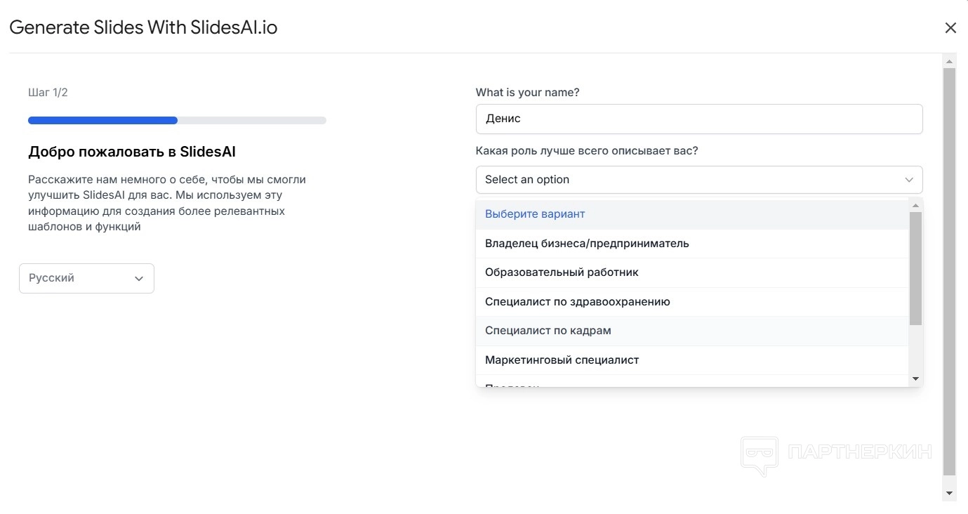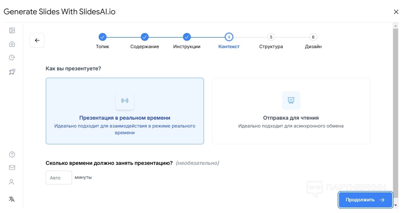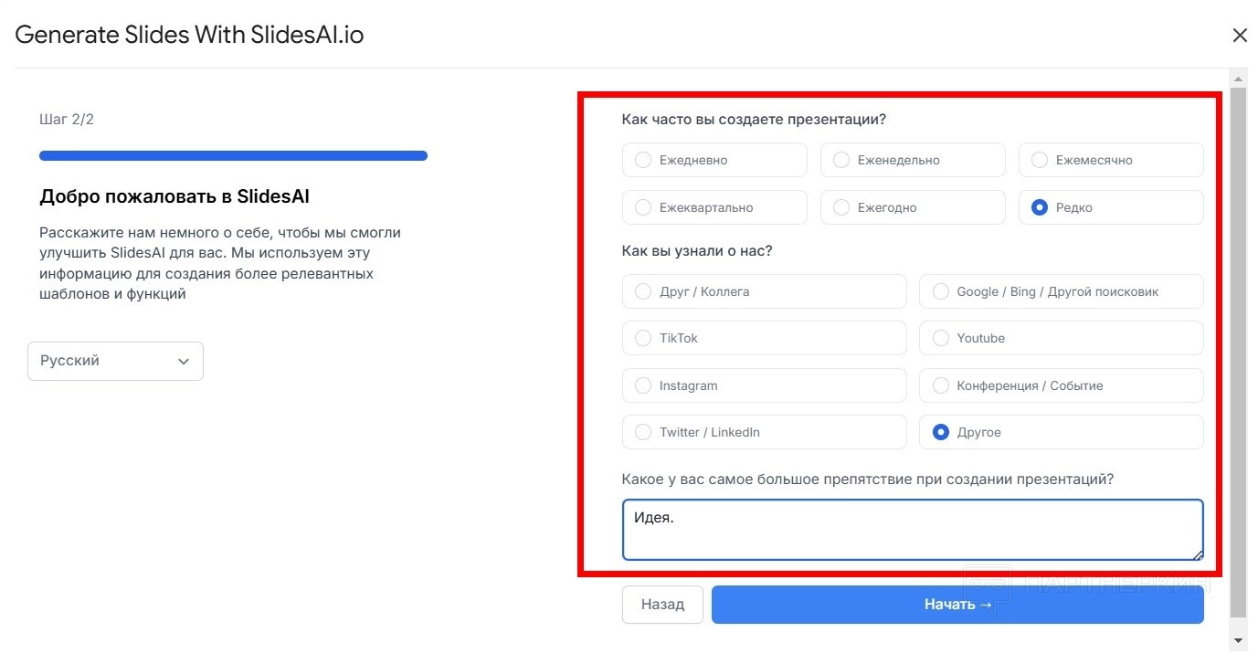 Процесс создания презентации простой и занимает от силы минут 5-10 минут. При этом пользователь может подробно настроить будущий контент: от общих тезисов до загрузки полного плана.
