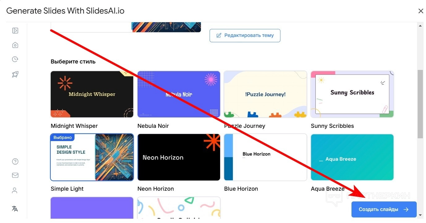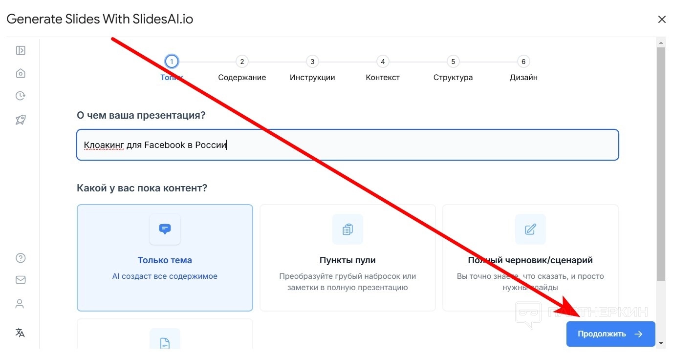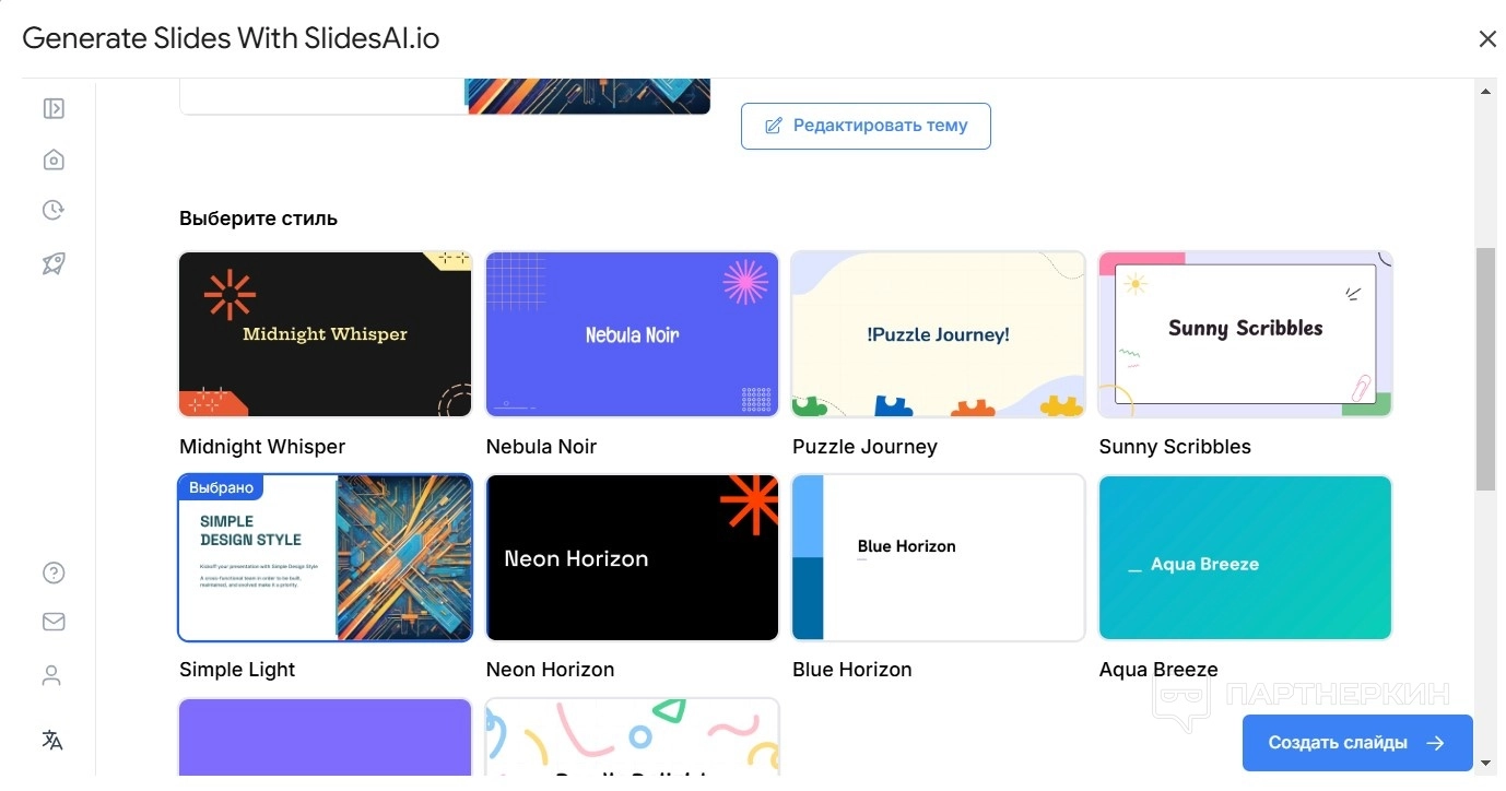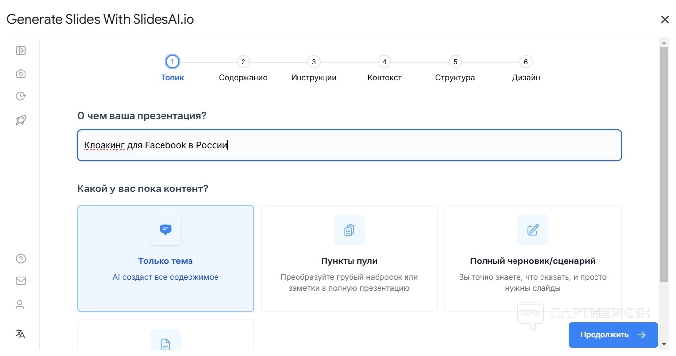 Процесс создания презентации простой и занимает от силы минут 5-10 минут. При этом пользователь может подробно настроить будущий контент: от общих тезисов до загрузки полного плана.
