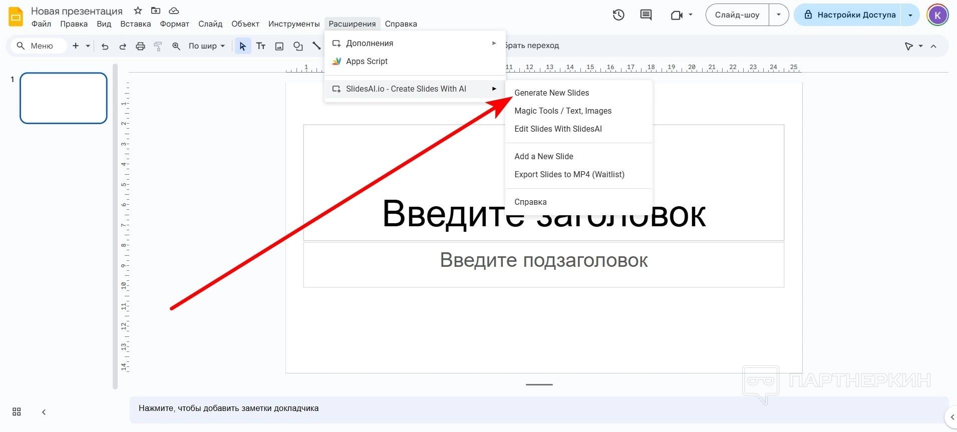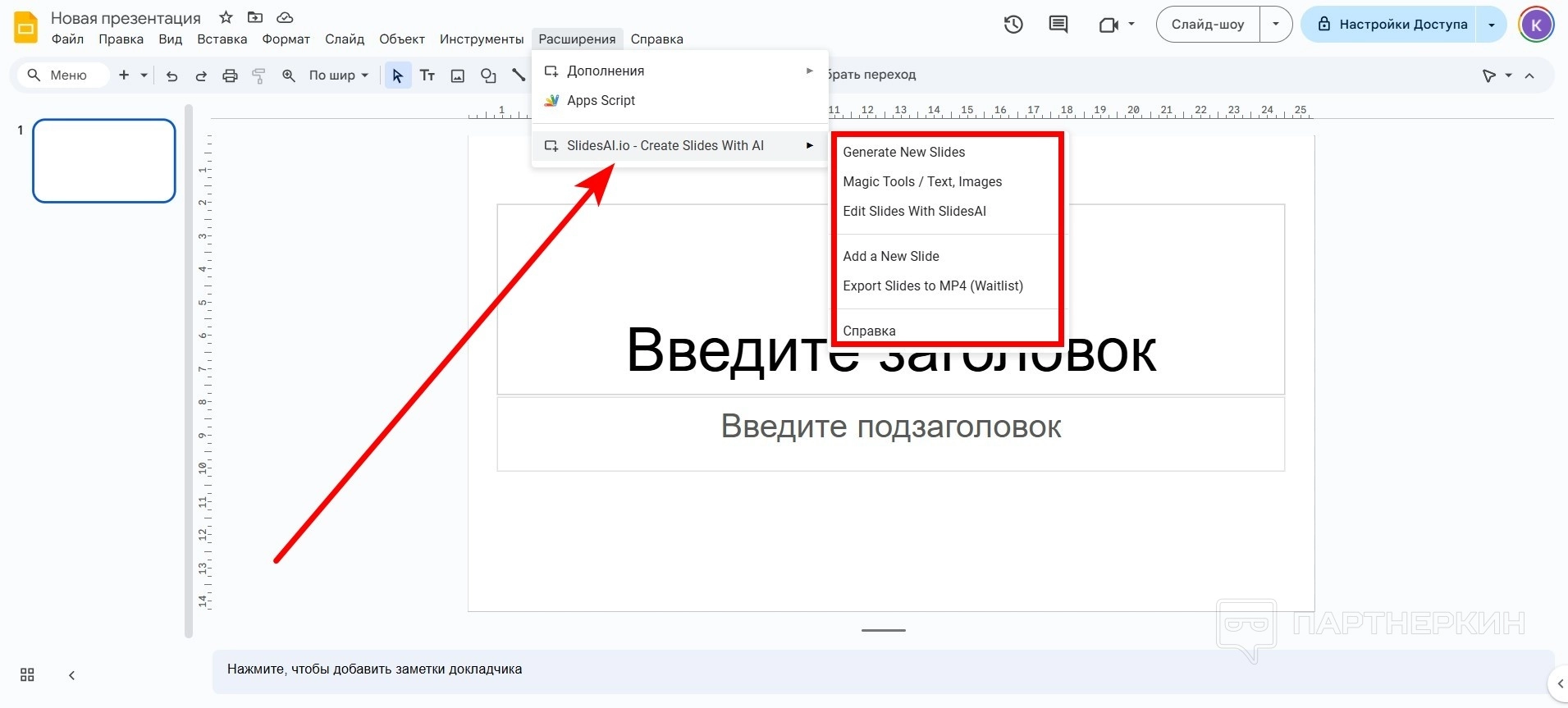 Можно начинать работать. Для этого нужно перейти в любой документ Google Презентации. Если всё сделано правильно, появится новое меню SlidersAI.io — Create Sliders With AI .
