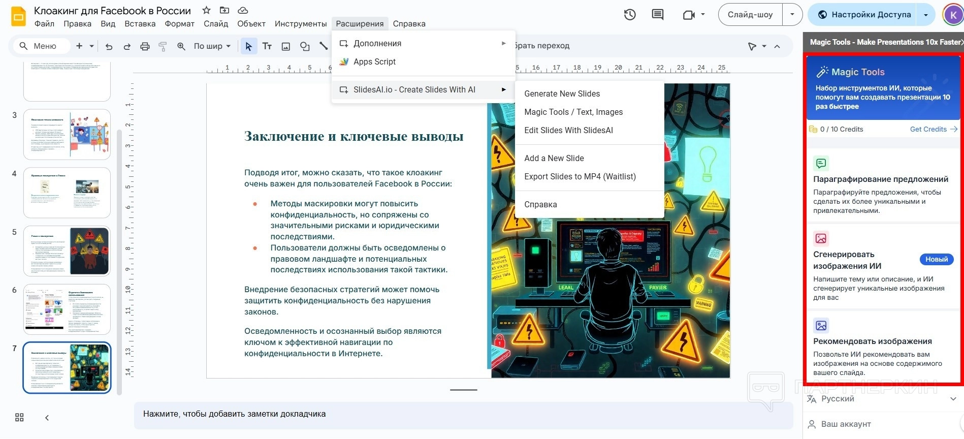 Нейросеть сгенерирует черновик презентации. Его можно сразу сохранять или отредактировать после вычитки. Также у расширения есть дополнительные инструменты, которые могут улучшить контент.
