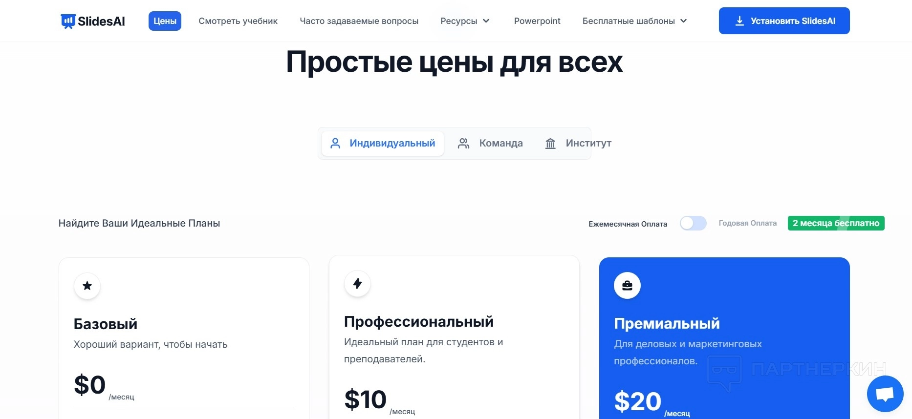 Является отличным выбором для начинающих пользователей. В этом тарифе включены 36 презентаций в год с ограничением в 2 500 символов ввода на каждую презентацию и 120 AI-кредитов. Пользователи также могут экспортировать до 12 видео в год, и вскоре ожидается возможность загружать документы. Базовый план полностью бесплатный и предоставляет все основные инструменты для создания презентаций. Однако работа в команде на этом этапе недоступна.