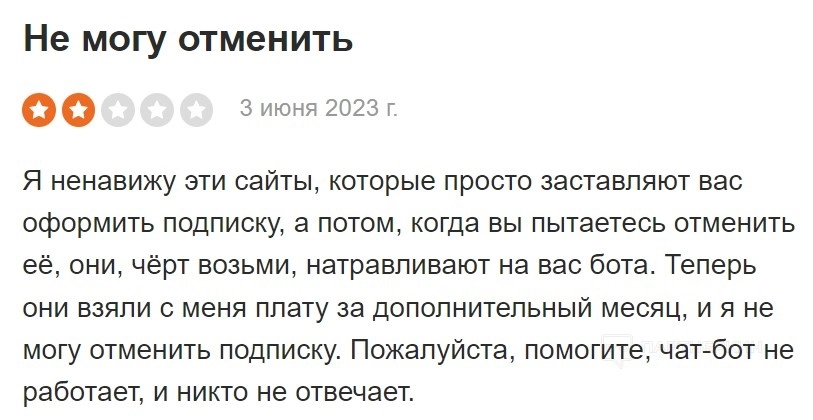 Однако недостатки также упоминаются в отзывах. Один из пользователей выразил недовольство процессом отмены подписки: попытки отказаться от услуг сталкиваются с отсутствием обратной связи от оператора, а общение осуществляется в основном через автоматизированного бота. Это вызывает неудобства и затрудняет решение проблемы напрямую.