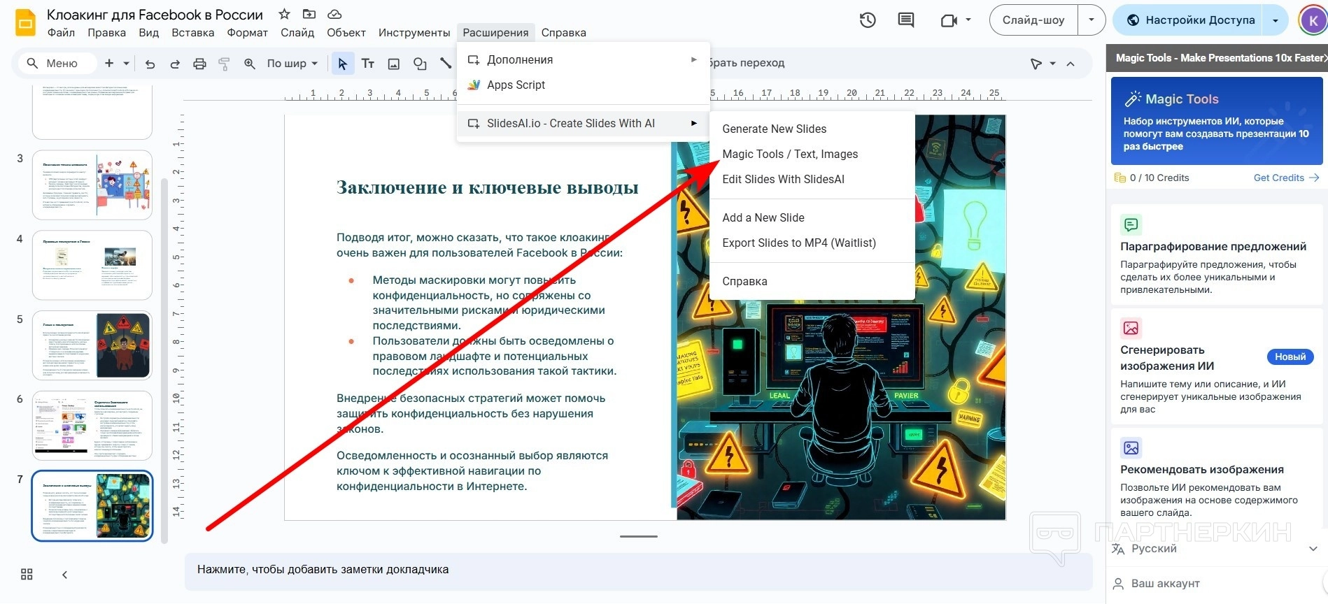 Magic Tools — это набор инструментов на базе искусственного интеллекта, созданный для ускорения процесса создания презентаций и повышения их качества. Расширение включает несколько специализированных опций, каждый из которых разработан для оптимизации и автоматизации разных аспектов презентационного процесса.