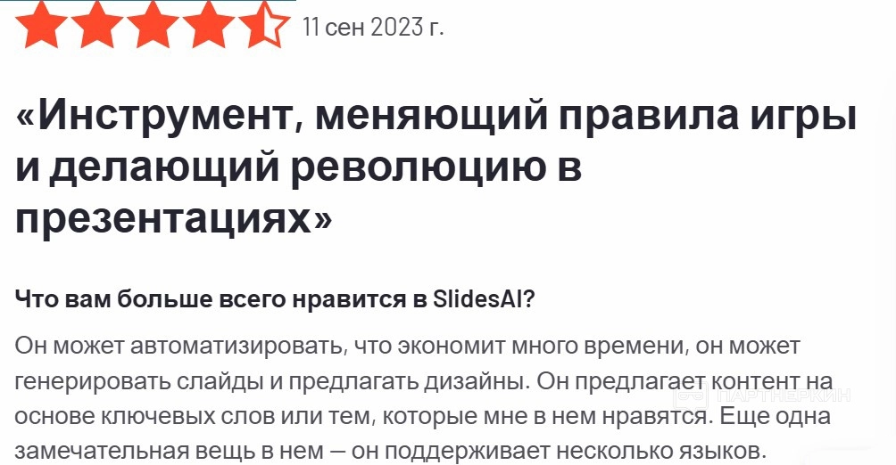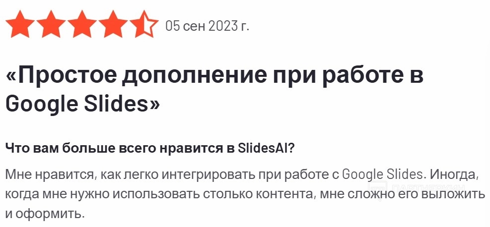 Другому пользователю понравилась возможность интеграции продукта с Google Sliders. Решение обеспечивает удобный и быстрый доступ к инструменту непосредственно через популярный сервис для работы с презентациями.