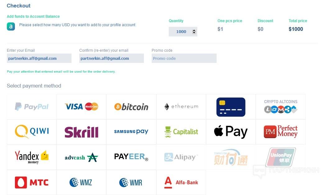 При клике по кнопке «Add Funds», вам откроется окно с выбором суммы пополнения счета, а также окна, где можно применить промокод на скидку. Ниже будет выбор платежных систем внутри вашего кабинета.