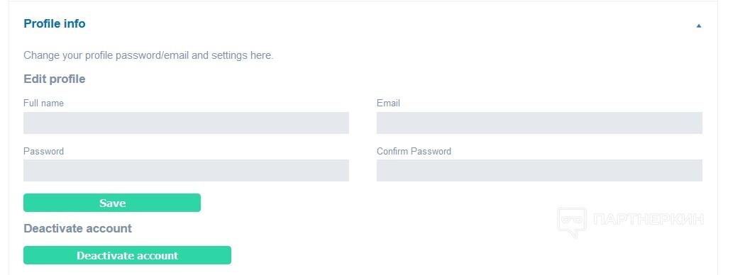 Ну и в завершение обзора личного кабинета рассмотрим вкладку «Profile Info» (Личные данные). В этой вкладке можно редактировать ваше имя, сменить пароль доступа к кабинету или деактивировать вашу учетную запись. Все это можно сделать в несколько кликов.