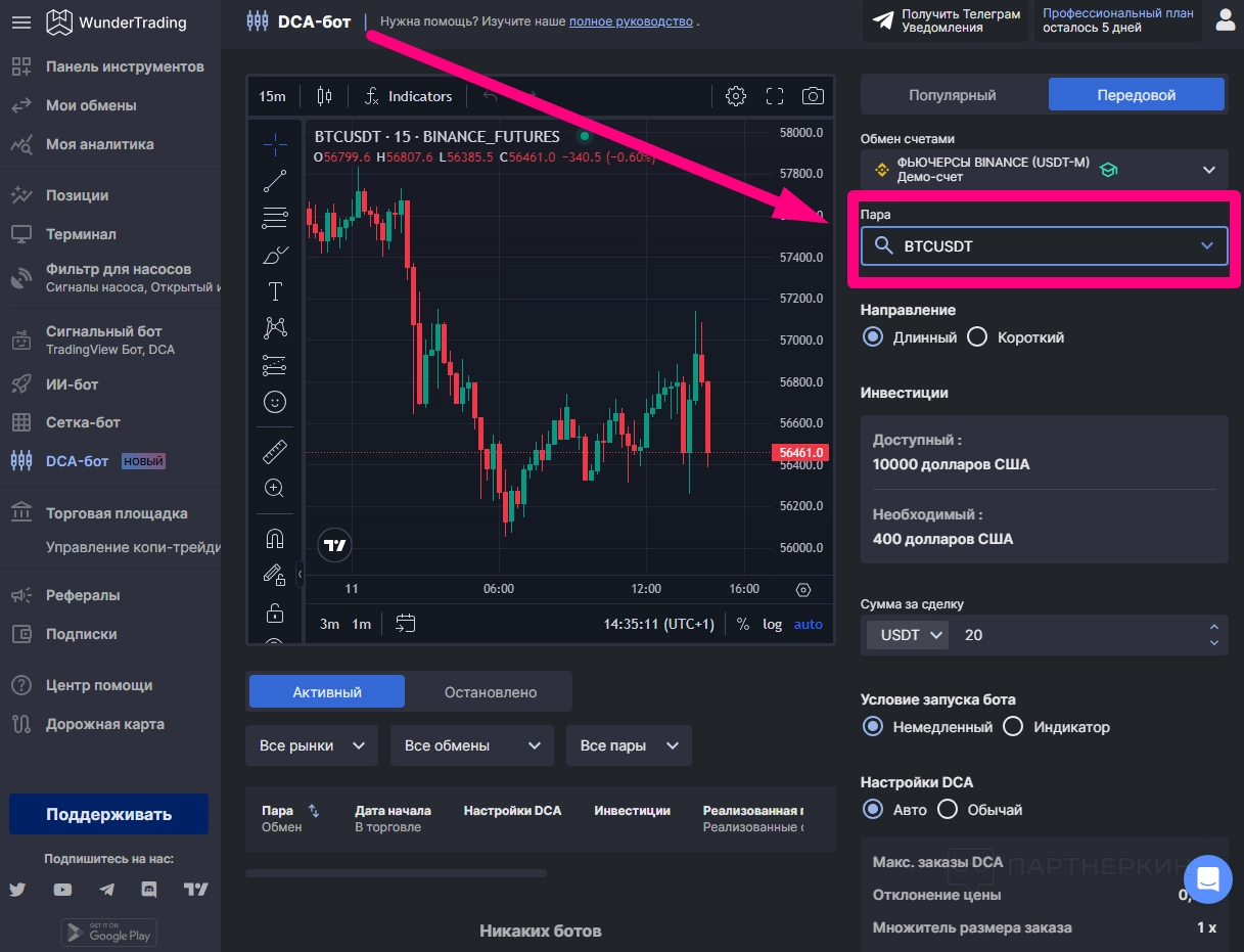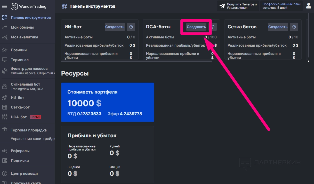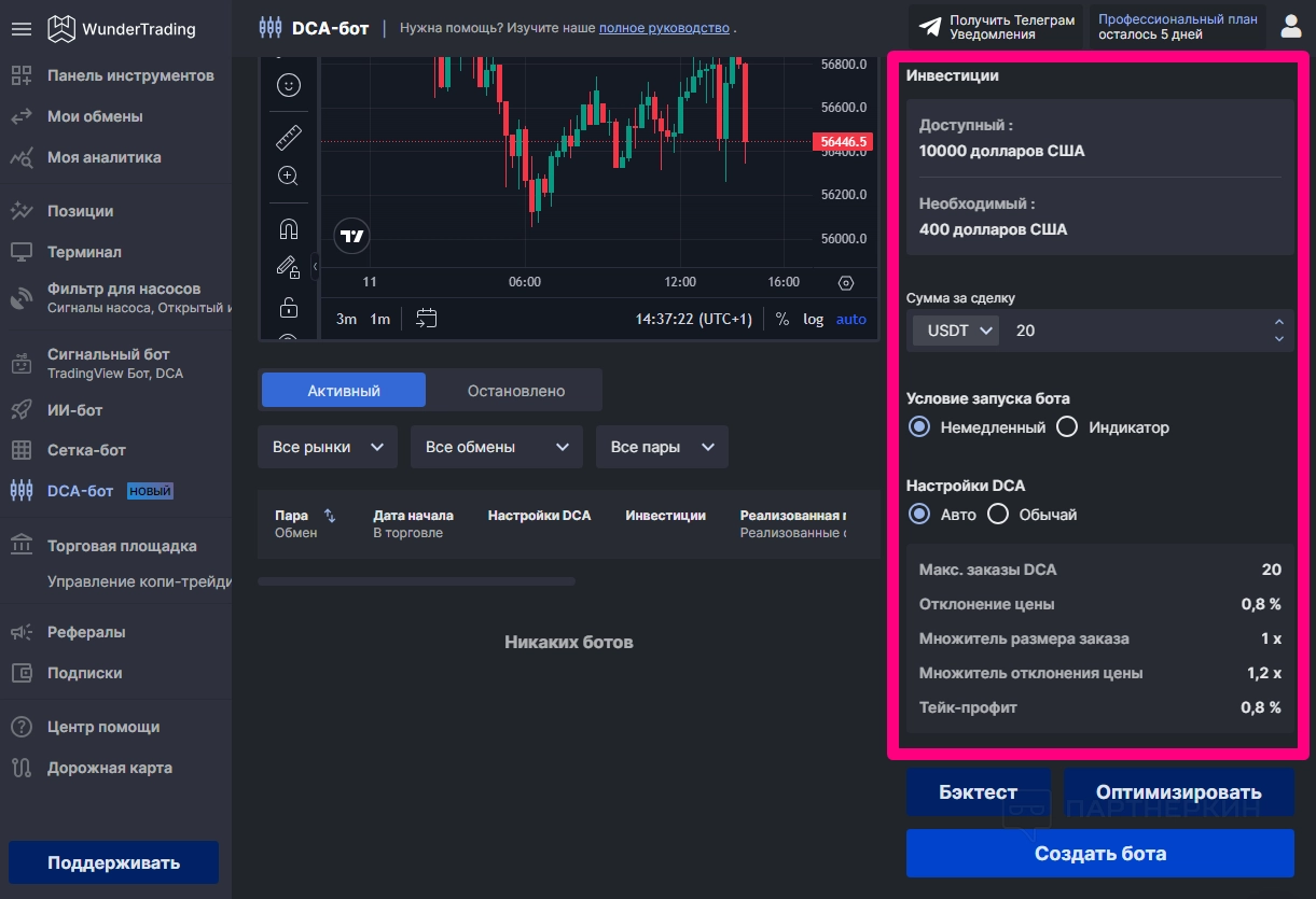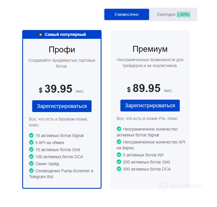 - Профи ($39,95/мес): план включает до 100 ботов DCA, 15 ботов Signal, 10 ботов Grid и 5 API на обмен. Добавлен свинг-трейдинг и оповещения в Telegram.
