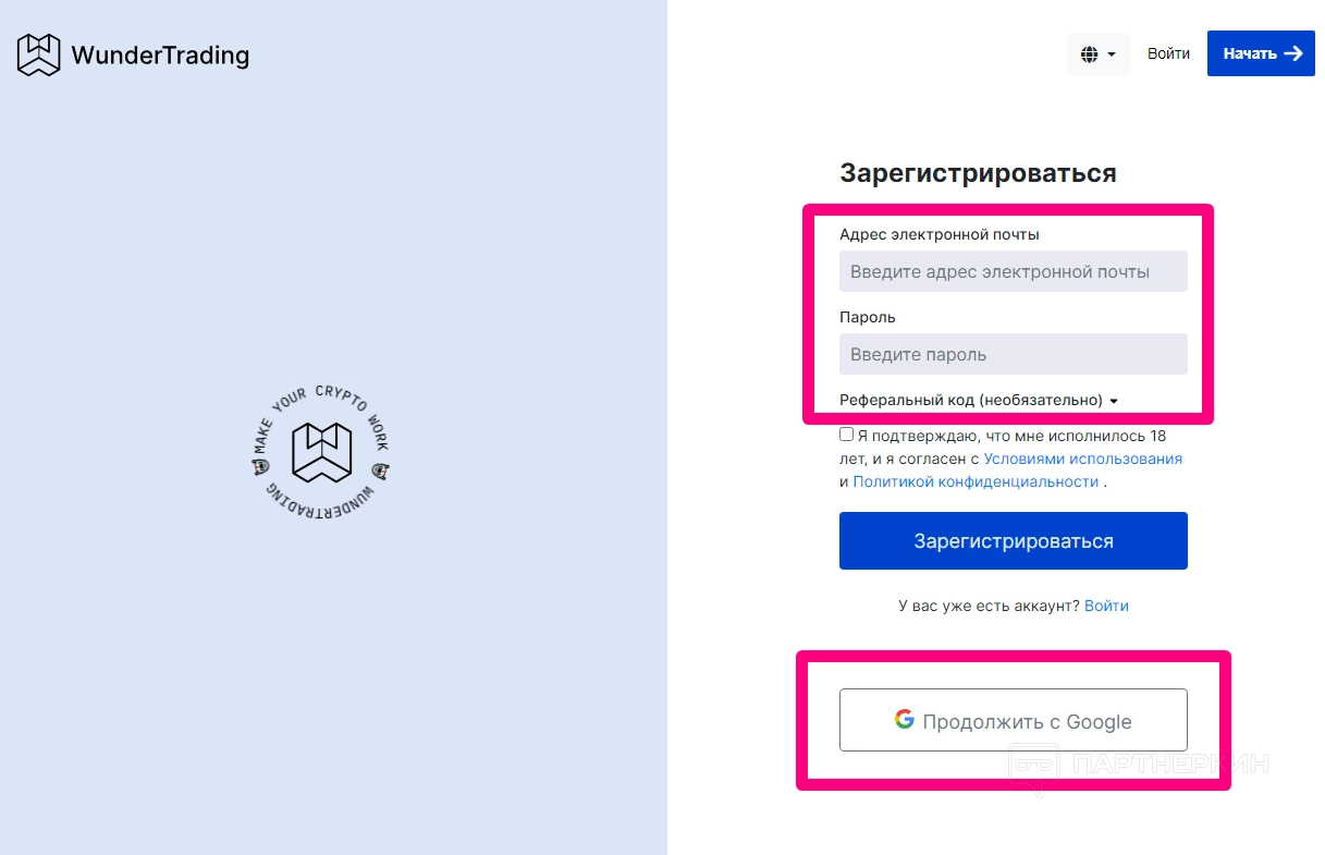 Откроется форма регистрации, где потребуется ввести электронную почту, пароль и, если есть, реферальный код. Есть возможность упростить процесс регистрации, используя аккаунт Google.