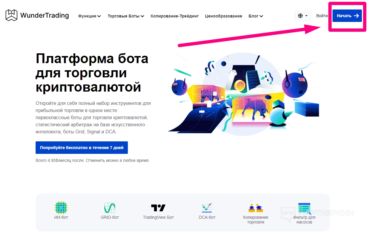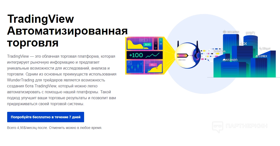 - WunderTrading выделяется копитрейдингом и гибкими настройками ботов через интеграцию с TradingView, а также поддержкой арбитража на множестве бирж.