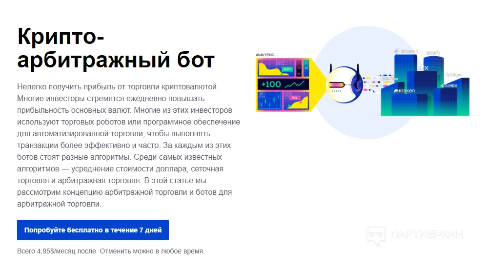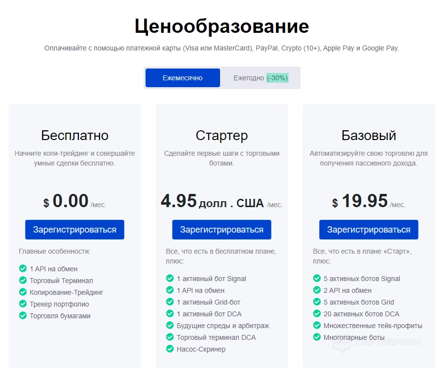 - Бесплатный ($0/мес): 1 API для обмена, торговый терминал, копитрейдинг и 1 активный бот.