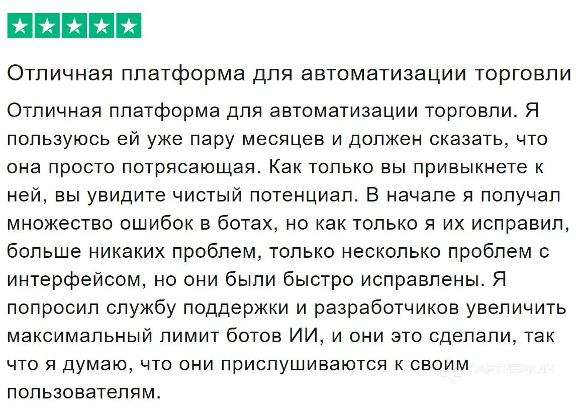 Пользователи также выделяют стабильную работу ботов после первоначальных настроек, поскольку для тех, кто тестирует стратегии, важны скорость исполнения сделок и широкий доступ к аналитическим данным. Поддержка также получает положительные отзывы за внимательное отношение к вопросам пользователей, что способствует хорошему впечатлению от сервиса в целом:
