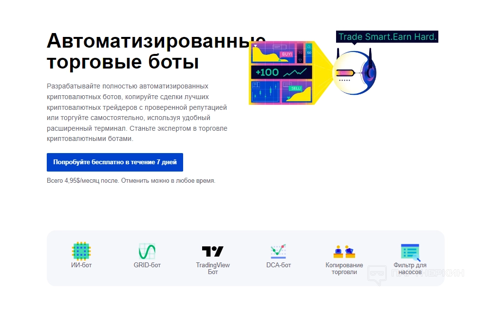 - Стартовый ($4,95/мес): включает в себя всё из бесплатного тарифа плюс 1 активный бот Grid и DCA. Подходит для первых шагов с ботами.