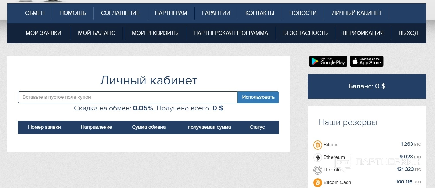 Интерфейс обменника представлен несколькими вкладками: