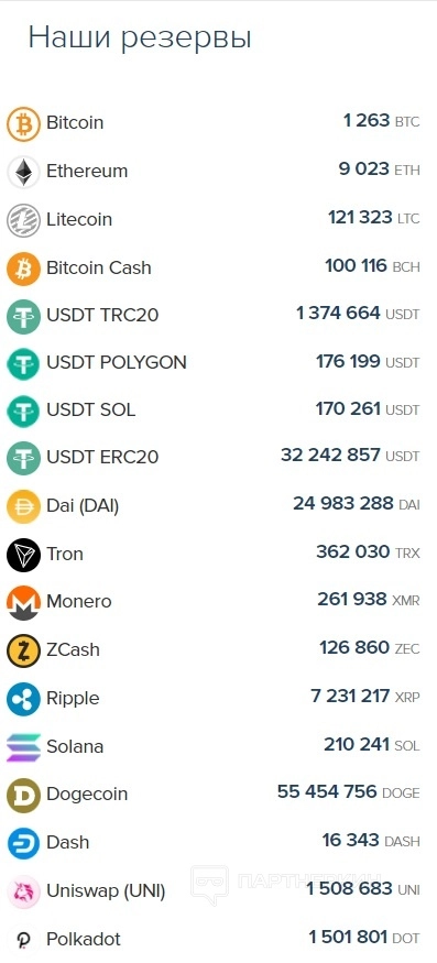 О своих резервах сервис заявляет, что обладает достаточными запасами, чтобы проводить сделки без лимитов, территориальных или временных ограничений. При совершении обменных операций клиент может увидеть резерв требуемой криптовалюты на главной странице. Отдельно есть страница с указанием резервов по всем валютам.