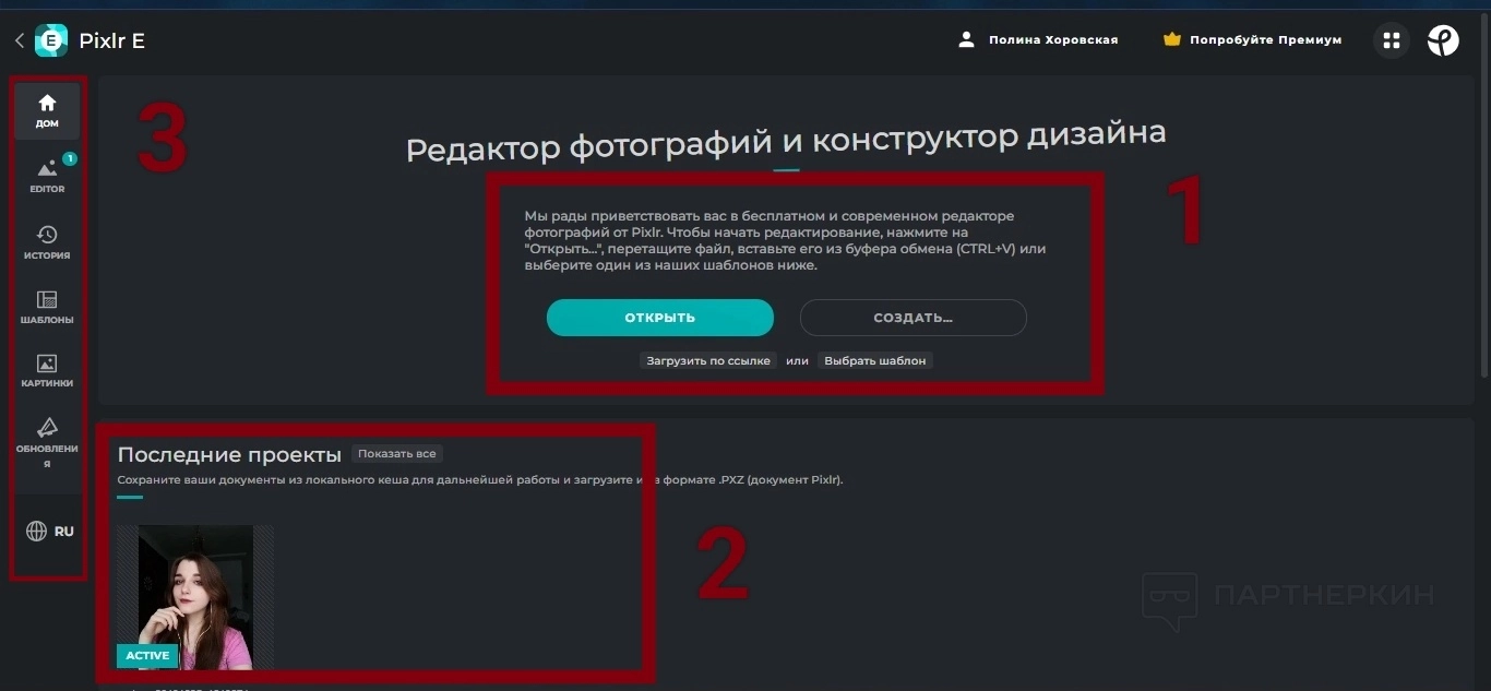 - Меню. В меню можно вернуться к редактированию открытого проекта, посмотреть историю действий, шаблоны, готовые картинки и обновления сервиса. Также можно настроить язык сервиса.
