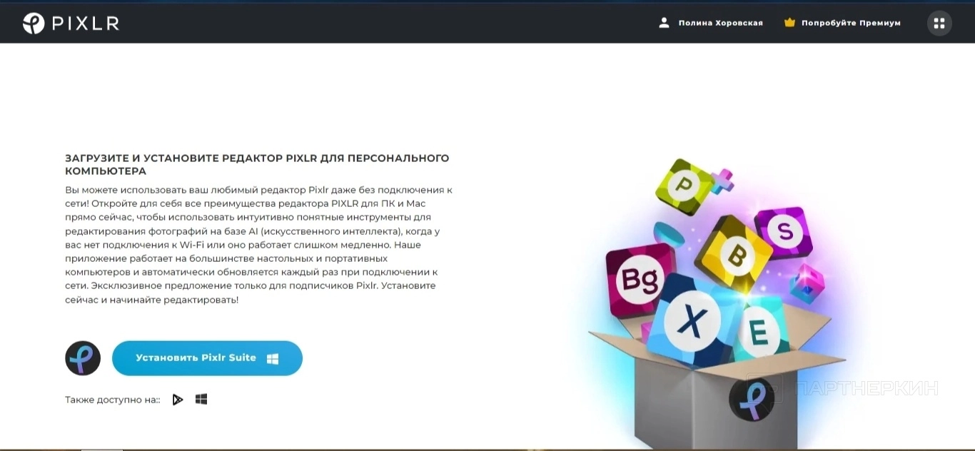 Чтобы скачать декстоп-версию Pixlr заходим в соответствующий раздел на сайте и скачиваем файл через магазин Google или Microsoft Store.