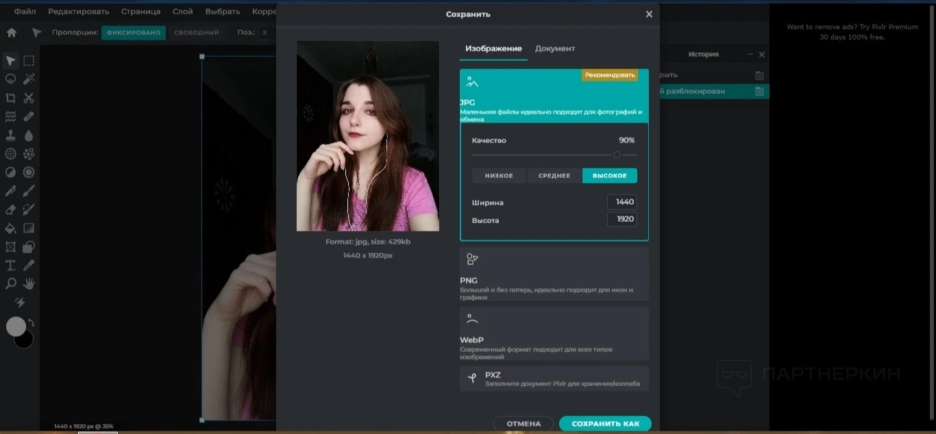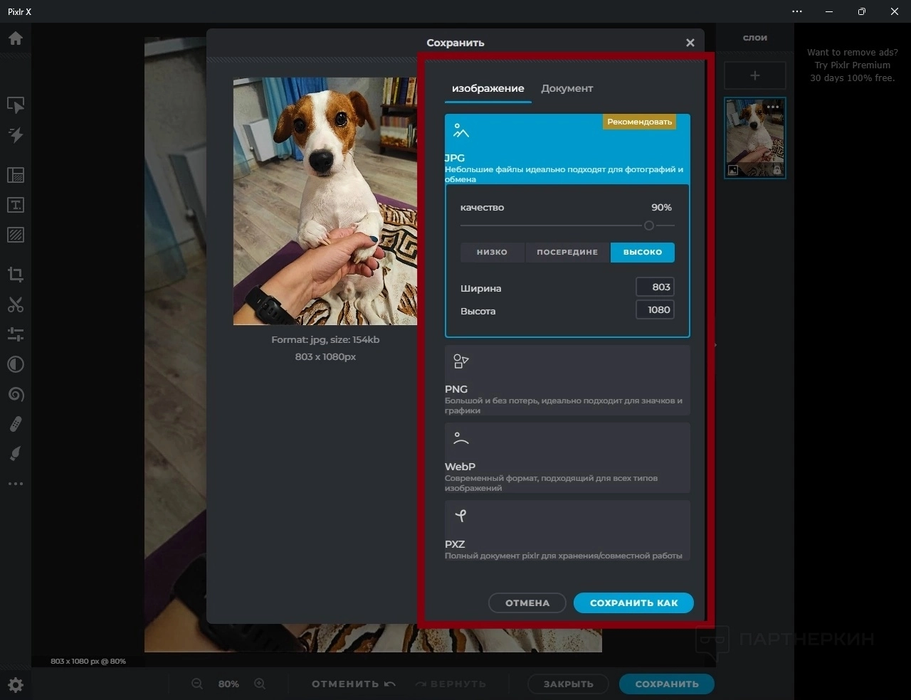Сохранить можно в формате изображения (JPG, PNG, WebP, PXZ) и в формате документа (PDF, PXZ).