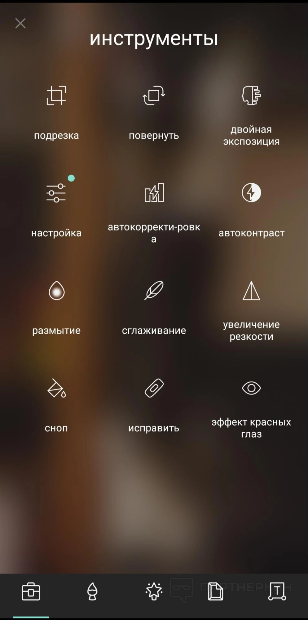 В зависимости от выбранного варианта, пользователю предложат загрузить одну или несколько фотографий или сфотографировать прямо в приложении. Готовое фото загружается в редактор, где основные инструменты располагаются внизу.