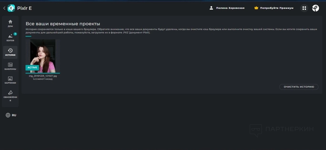 Все текущие проекты сохраняются в таком виде в том же главном окне выбранного редактора. В этом же окне сервис предупреждает о недолговечности сохранения проектов: только до момента очистки кэша браузера. Чтобы сохранить на долгое время, необходимо сохранять проект в формате PXZ.