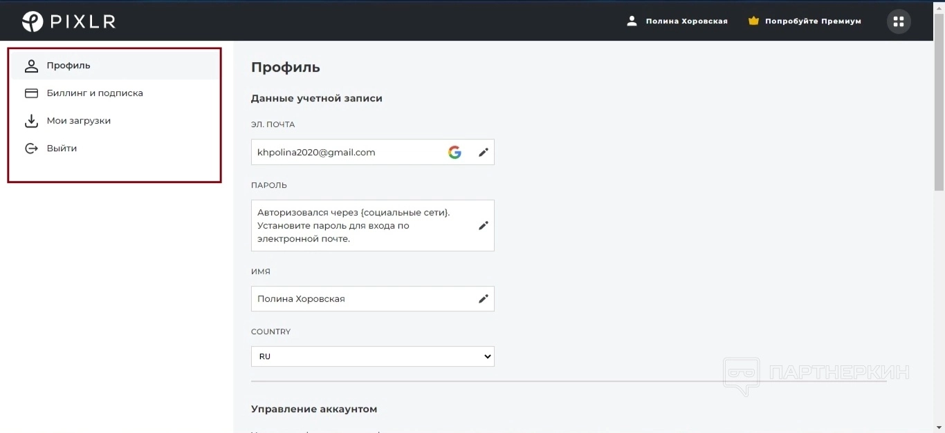 После этого нас перенесет в кабинет, где можно настроить свой аккаунт, просмотреть свои подписки и тариф, а также свои загрузки или просто выйти из учетной записи: