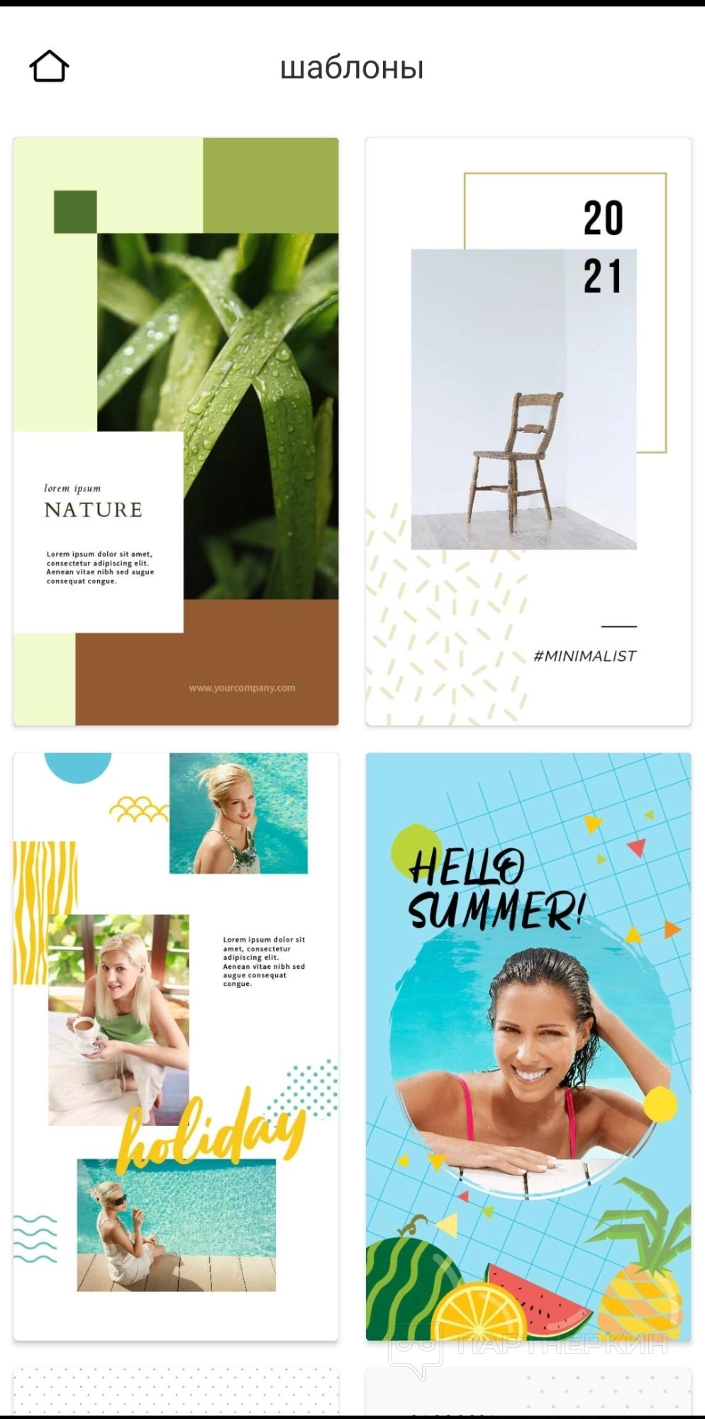 Сразу заметно невооруженным глазом кардинальное отличие от веб-версии сервиса. На главном экране сразу можно начать работу с шаблонами, сделать коллаж, создать новое фото или загрузить с устройства. Также встроена реклама дочерних приложений для работы с визуалом. Примечательным является и отсутствие авторизации в личном кабинете, однако некоторые возможности приложения доступны после покупки Премиум подписки, для которой авторизация понадобится.