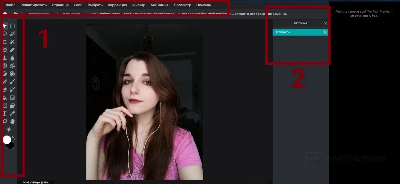 В режиме редактирования пользователю предоставляется огромное количество инструментов, которые находятся в верхней строке экрана и в столбце слева. В редакторе можно работать со слоями, цветокоррекцией, рисовать на изображении и многое другое. Сами слои отображаются слева.