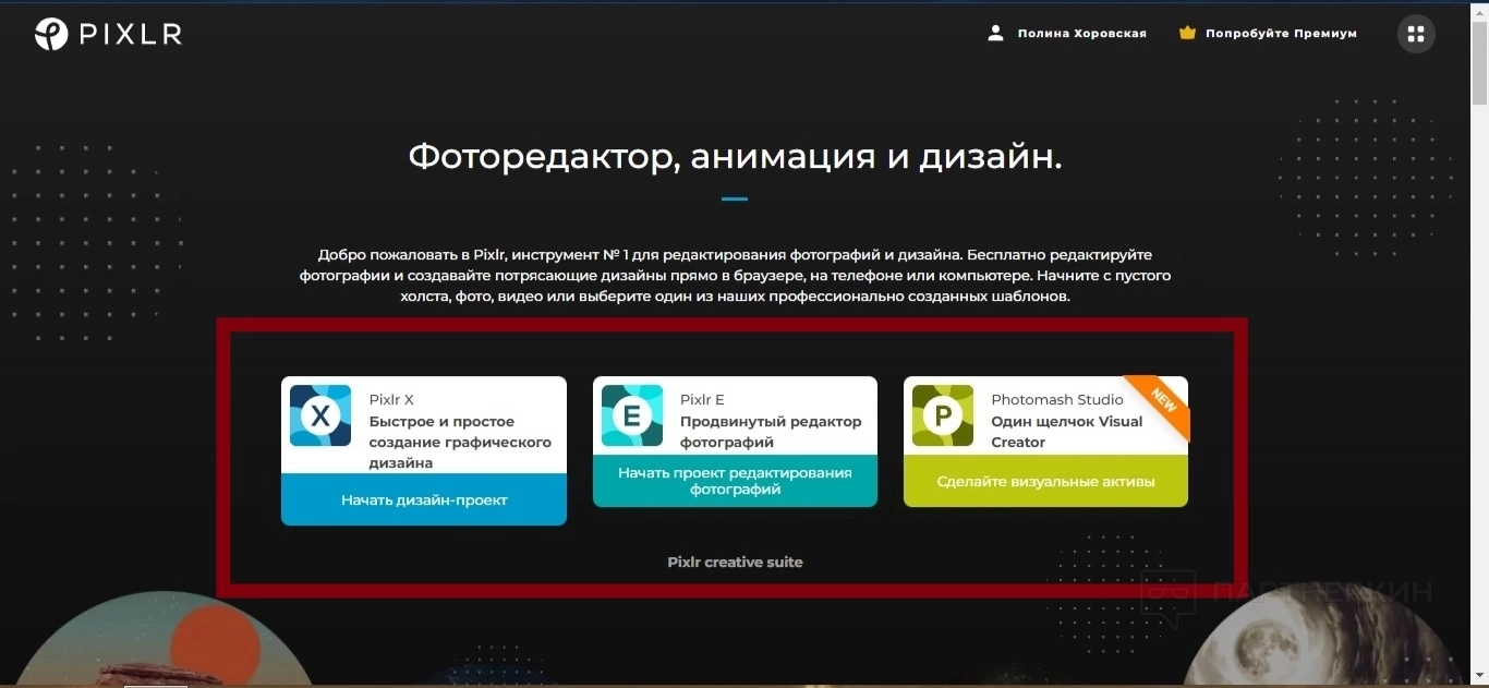 По сути, основные возможности представлены сразу на главном экране. Это возможность создания дизайн-проекта, редактирование фотографий и недавняя новинка — визуальные активы: