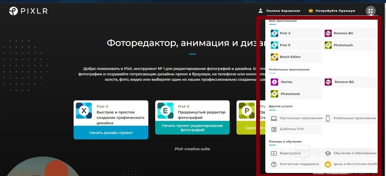 Отличительной чертой в интерфейсе сервиса является упрощенная навигация по веб-сайту. Чтобы с легкостью попасть в любой удобный редактор или попробовать другие инструменты компании, достаточно нажать на четыре квадрата в правом верхнем углу: