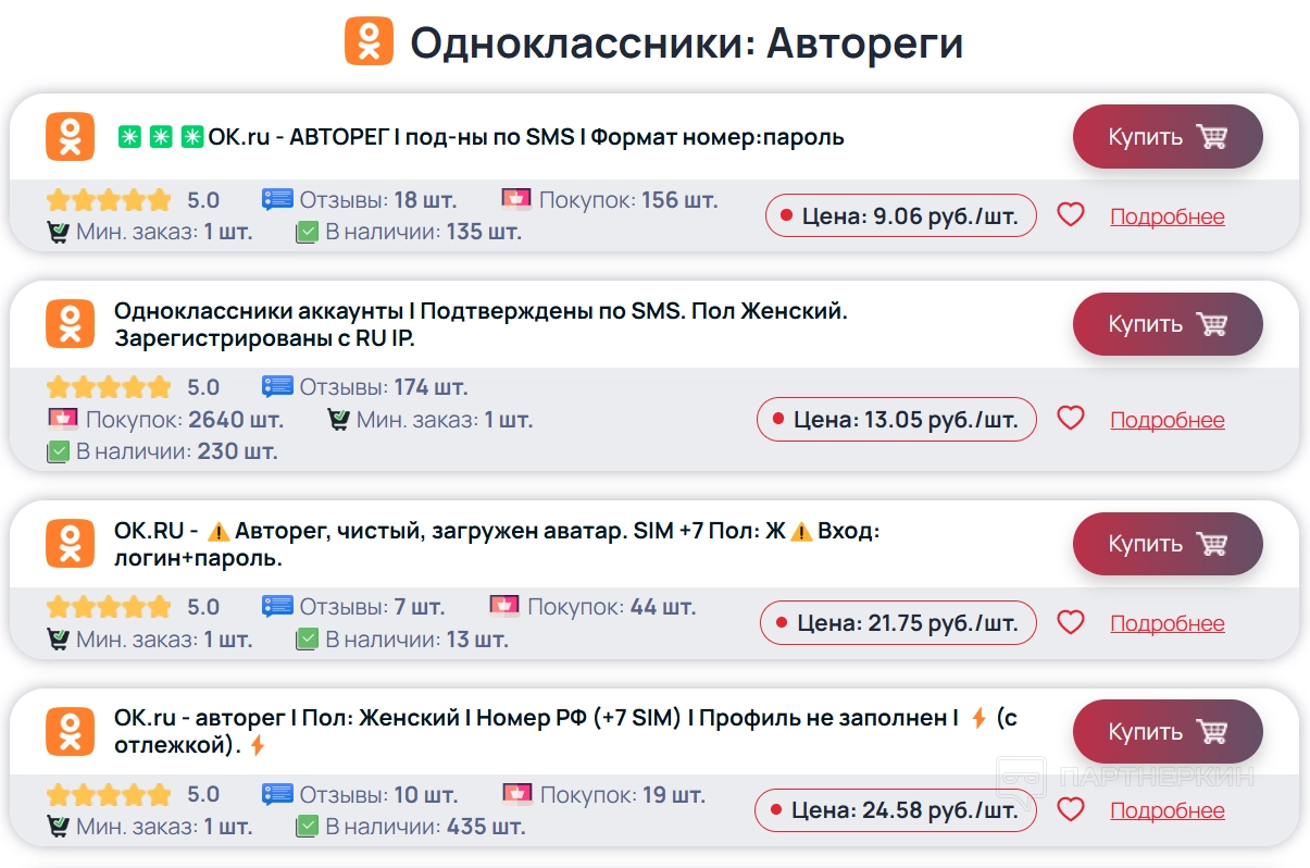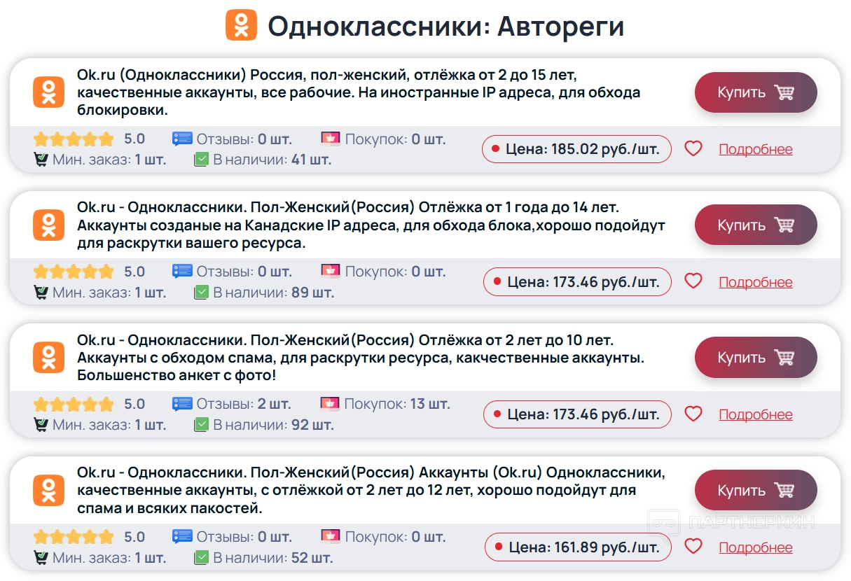 В разделе «Одноклассники» цены на аккаунты начинаются от 9 руб./шт. за автореги, подтвержденные по SMS, и доходить до порядка 185 руб./шт. за «выдержанные» профили с многолетней отлежкой и высоким уровнем доверия.
