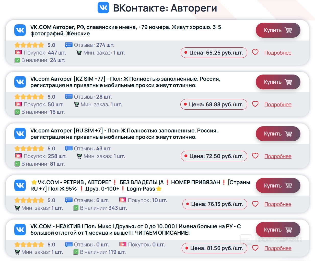 Для примера можно привести расценки на некоторые аккаунты. Так, в разделе «ВКонтакте» можно встретить лоты стоимостью от примерно 65 руб./шт. за простые автореги до более 1000 руб./шт. за аккаунты с привязанными номерами и наполненным профилем.