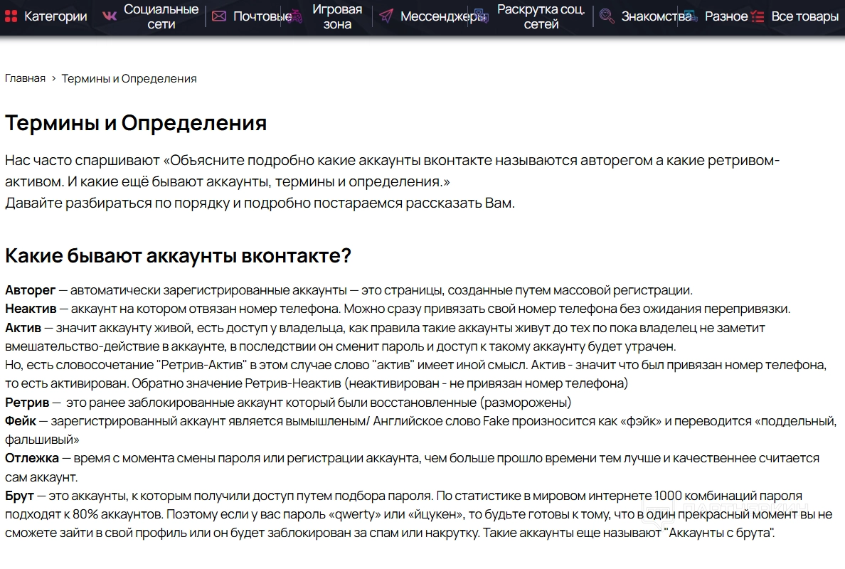 На сайте имеется раздел «Термины и Определения», где поясняются понятия вроде «авторег», «саморег», «ретрив-актив» и других разновидностей аккаунтов. Наличие такой справочной информации потенциально упрощает ориентирование, но сам факт, что эти термины вынесены в отдельный раздел, говорит о том, что пользователю поначалу все же придется уделить внимание изучению этих определений.