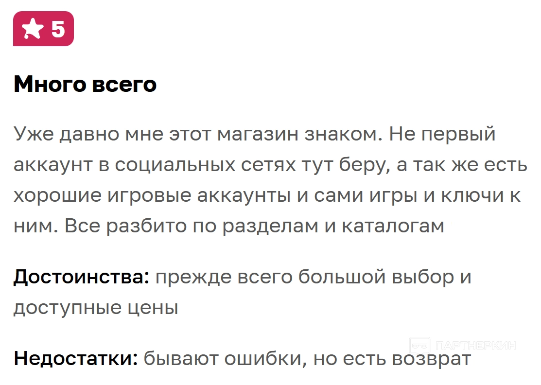 Некоторые покупатели, совершающие повторные покупки, отмечают широкий ассортимент не только аккаунтов социальных сетей, но и игровых товаров. Они указывают на удобную навигацию, логичное распределение по разделам и понятные каталоги:
