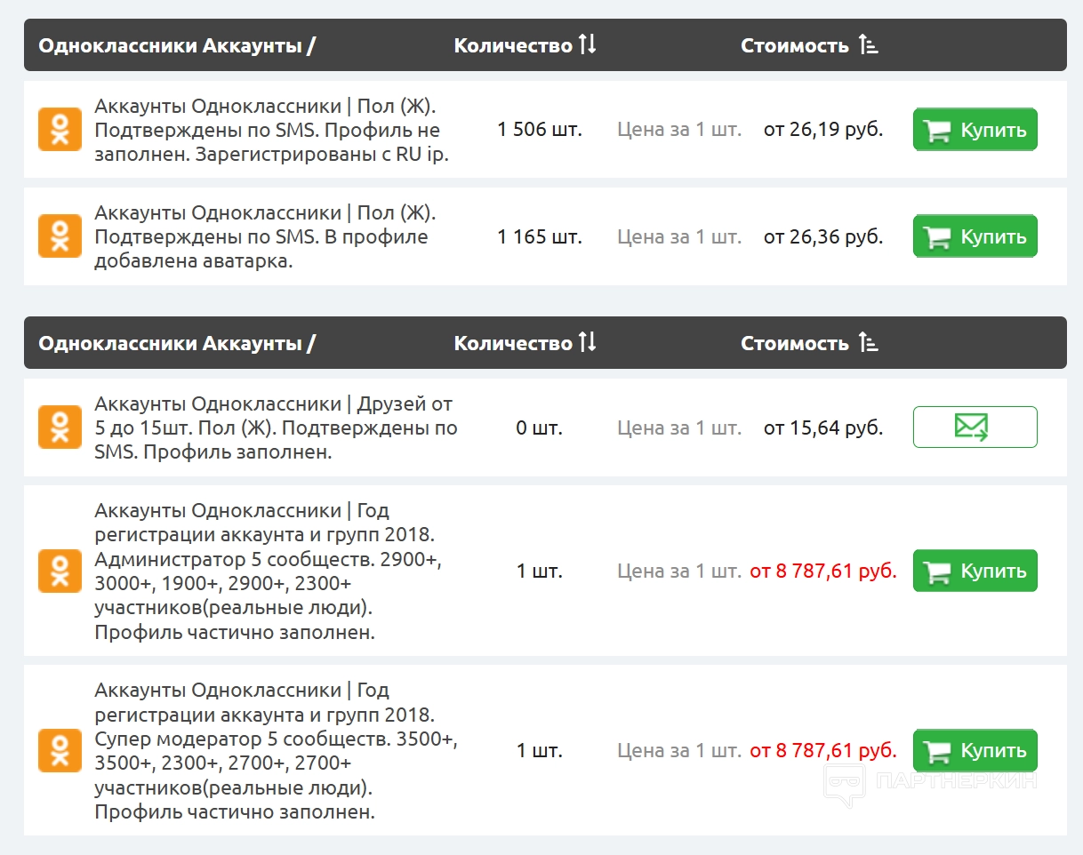 , но сопровождается иными условиями гарантий и поддержки. Для примера приведем цены на AccsMarket за аккаунты на площадке Одноклассники: