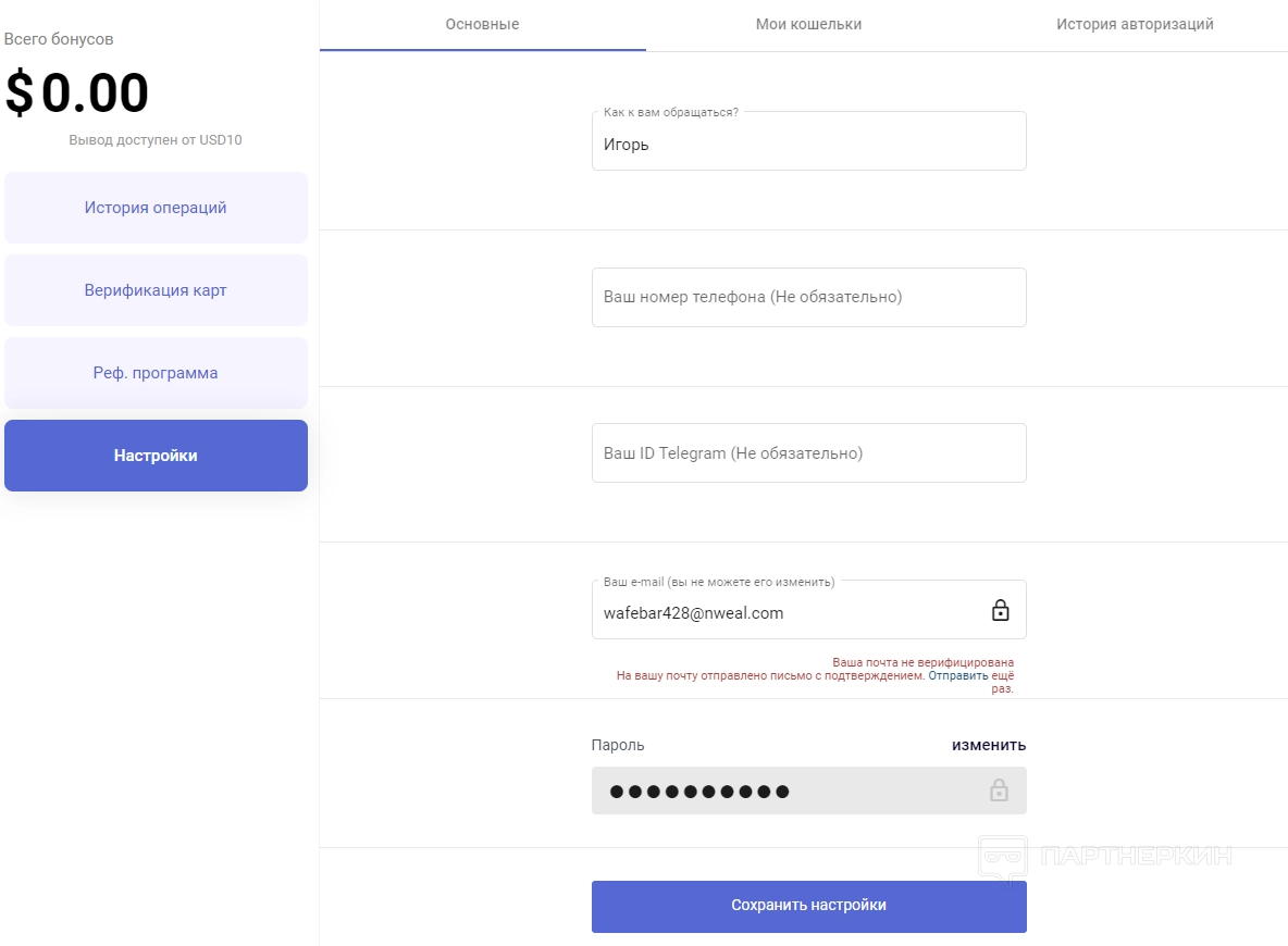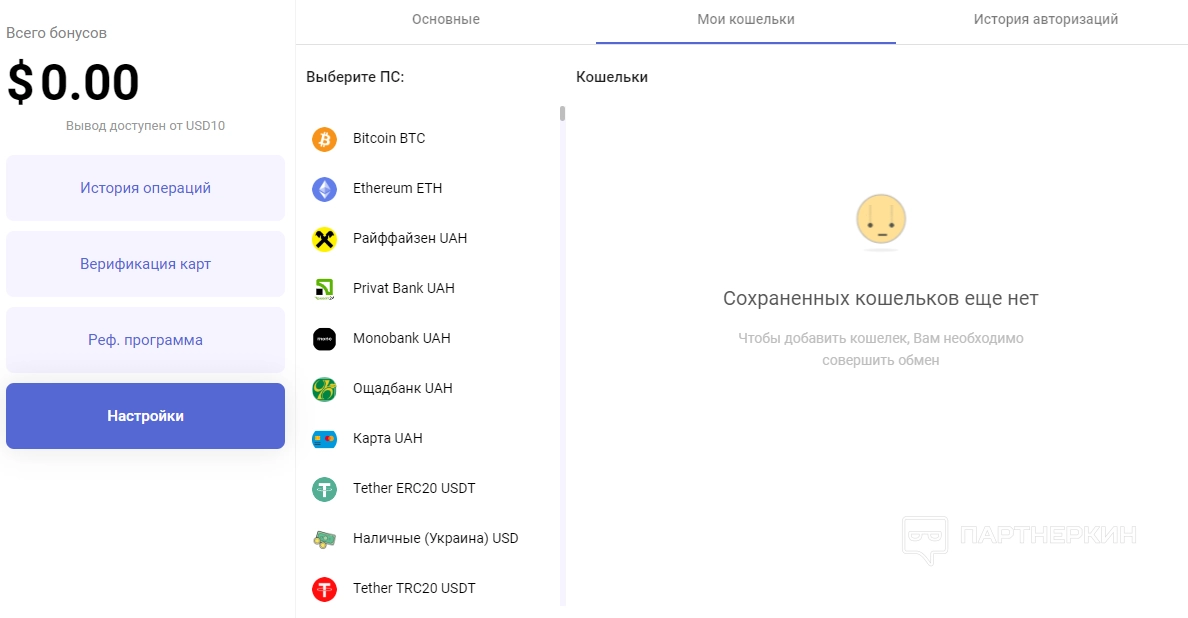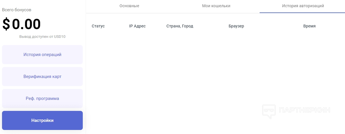 Реферальная программа . На этой странице вы можете скопировать ссылку для приглашения знакомых. Здесь также представлена следующая статистика: история операций, сколько средств заработано за рефералов, количество привлеченных клиентов.
