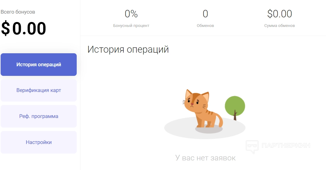 История операций . Здесь доступна статистика по всем совершенным обменам: бонусный процент, количество транзакций, общая сумма.