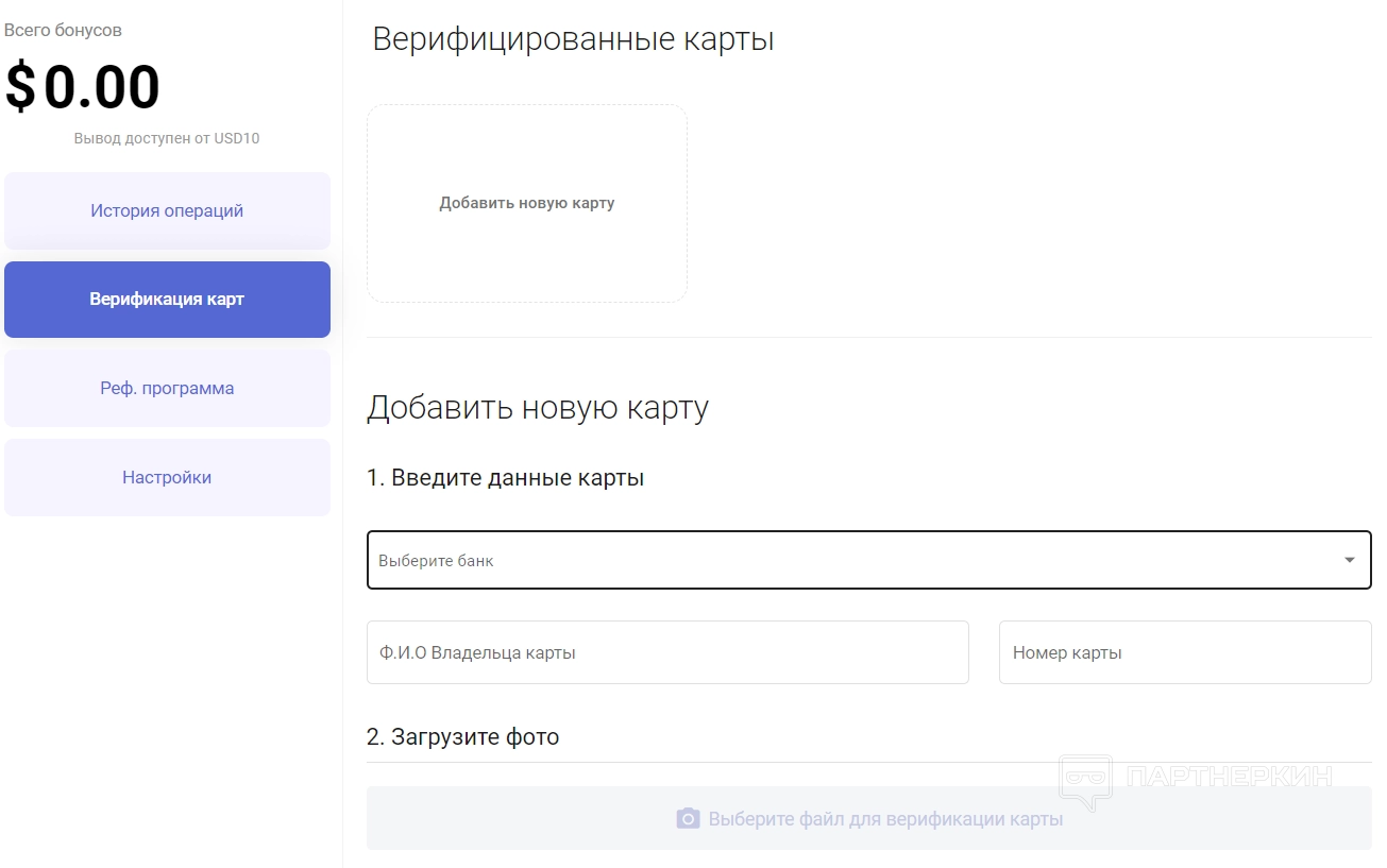 Верификация карт . В этом разделе вы можете добавить новую карту. Для этого укажите банк, ФИО владельца и номер. Следующий шаг — загрузите фотографию для верификации.